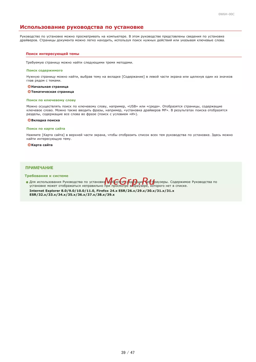 0W6H 00C Использование руководства по установке Руководство по установке можно просматривать на компьютере В этом руководстве представлены сведения по установке драйверов Страницы документа можно легко находить используя поиск нужных действий или указывая ключевые слова Поиск интересующей темы Требуемую страницу можно найти следующими тремя методами Поиск содержимого Нужную страницу можно найти выбрав тему на вкладке Содержание в левой части экрана или щелкнув один из значков глав рядом с темами Начальная страница Тематическая страница Поиск по ключевому слову Можно осуществлять поиск по ключевому слову например USB или среда Отобразятся страницы содержащие ключевое слово Можно также вводить фразы например установка драйверов MF В результатах поиска отобразятся разделы содержащие все слова во фразе поиск с условием И О Вкладка поиска Поиск по карте сайта Нажмите Карта сайта в верхней части экрана чтобы отобразить список всех тем руководства по установке Здесь можно найти интересующую тему Карта сайта ПРИМЕЧАНИЕ Требования к системе Для использования Руководства по установке требуются следующие веб браузеры Содержимое Руководства по установке может отображаться неправильно при просмотре в браузере которого нет в списке Internet Explorer 8 0 9 0 10 0 11 0 Firefox 24 x ESR 26 x 29 x 30 x 31 x 31 x ESR 32 x 33 x 34 x 35 x 36 x 37 x 38 x 39 x 39 47
