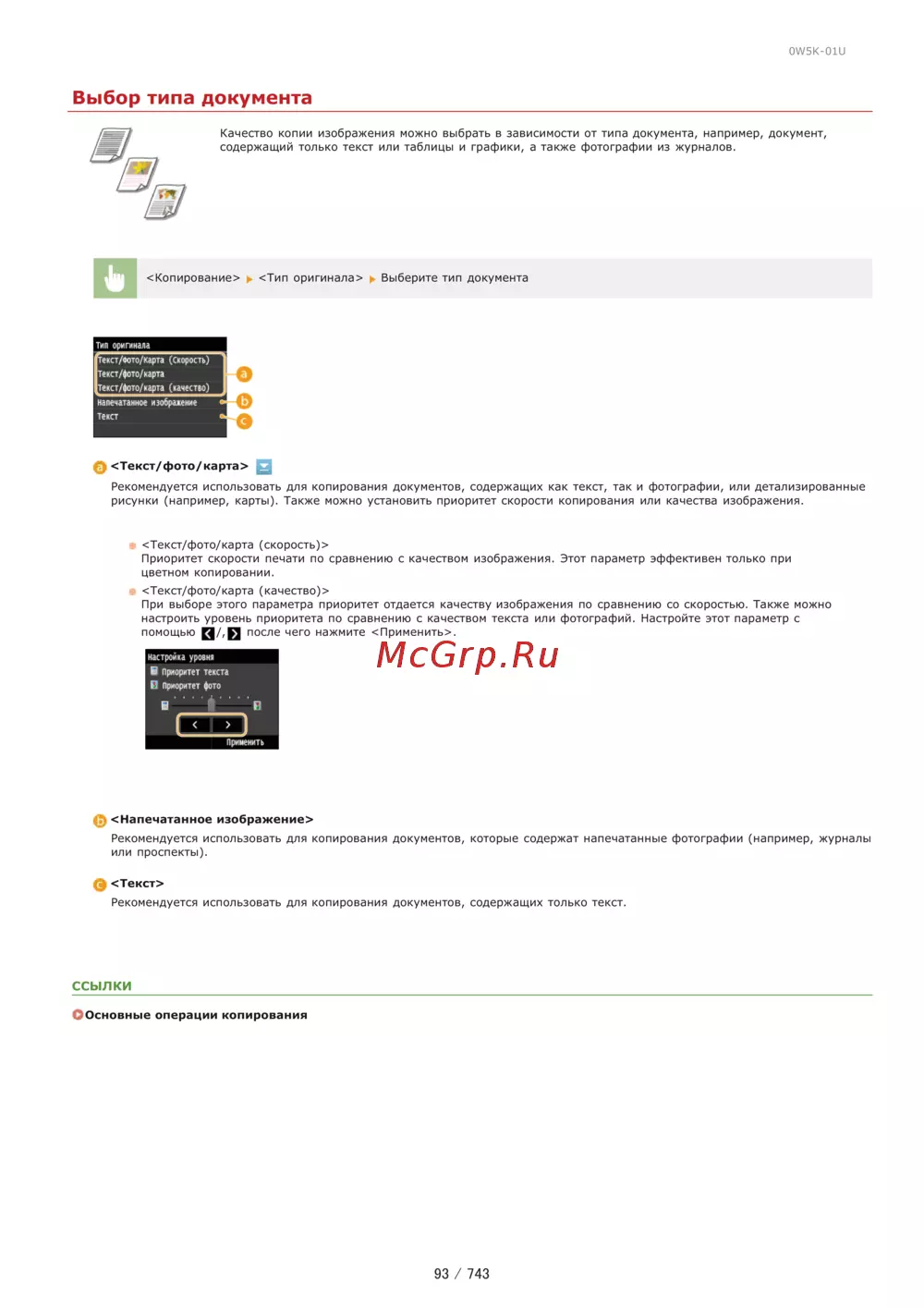 0W5K 01U Выбор типа документа Качество копии изображения можно выбрать в зависимости от типа документа например документ содержащий только текст или таблицы и графики а также фотографии из журналов Копирование Тип оригинала Выберите тип документа тип оригинала текст Фото карта скорость Техст фото харга Тексг фото харта вачество намчаганиае изображение тект Текст фото карта В Рекомендуется использовать для копирования документов содержащих как текст так и фотографии или детализированные рисунки например карты Также можно установить приоритет скорости копирования или качества изображения Текст фото карта скорость Приоритет скорости печати по сравнению с качеством изображения Этот параметр эффективен только при цветном копировании Текст фото карта качество При выборе этого параметра приоритет отдается качеству изображения по сравнению со скоростью Также можно настроить уровень приоритета по сравнению с качеством текста или фотографий Настройте этот параметр с помощьюНИпосле чего нажмите Применить 0 Напечатанное изображение Рекомендуется использовать для копирования документов которые содержат напечатанные фотографии например журналы или проспекты 3 Текст Рекомендуется использовать для копирования документов содержащих только текст ССЫЛКИ ООсновные операции копирования 93 743