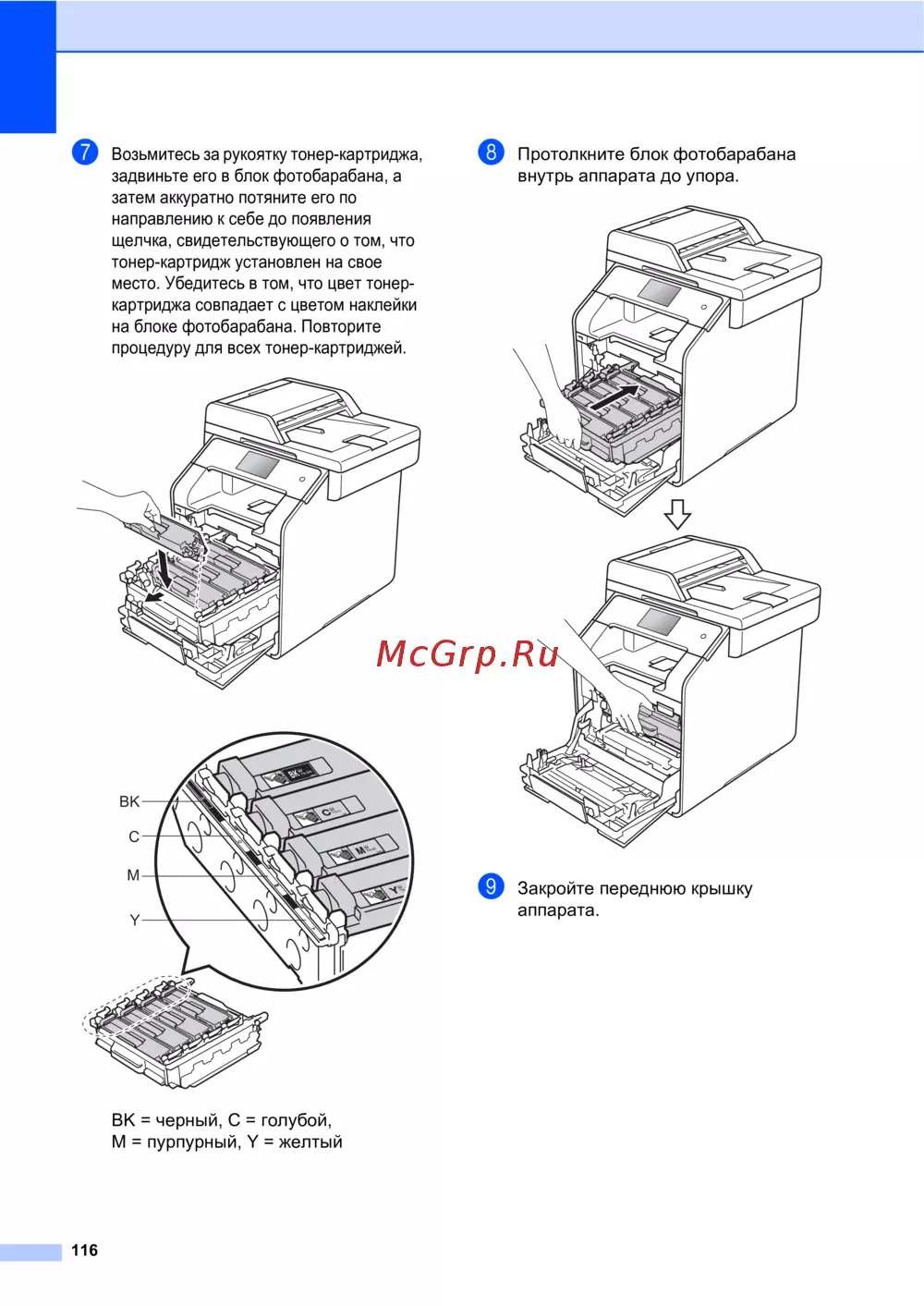 Brother MFC-L9550CDW — установка тонер-картриджа в фотобарабан: пошаговая инструкция [126/269]