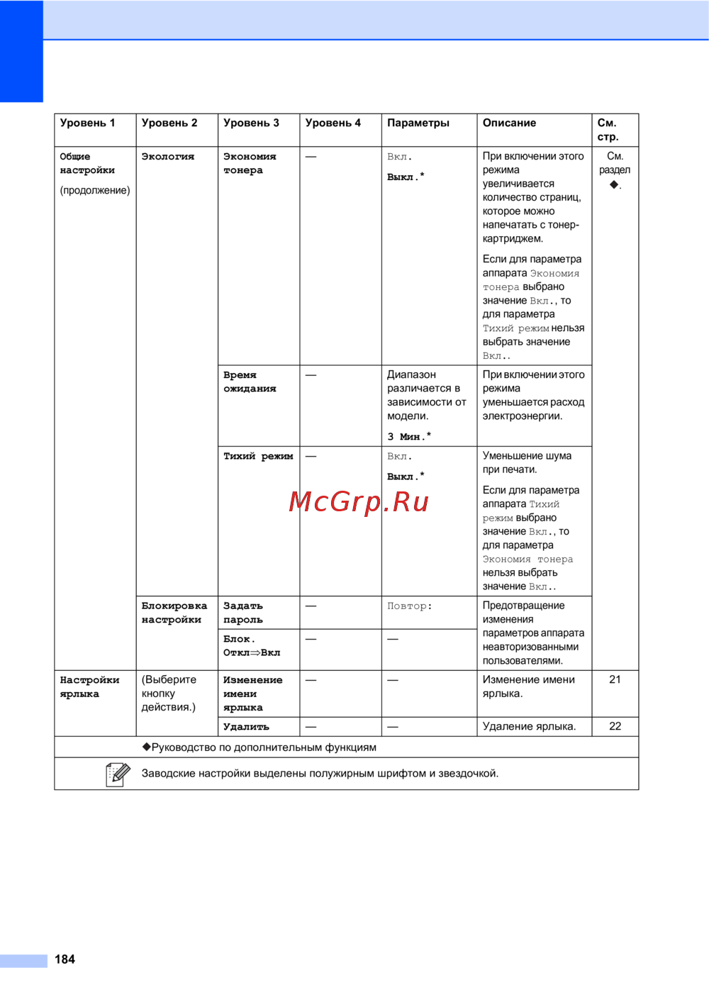 Заводские настройки выделены полужирным шрифтом и звездочкой.