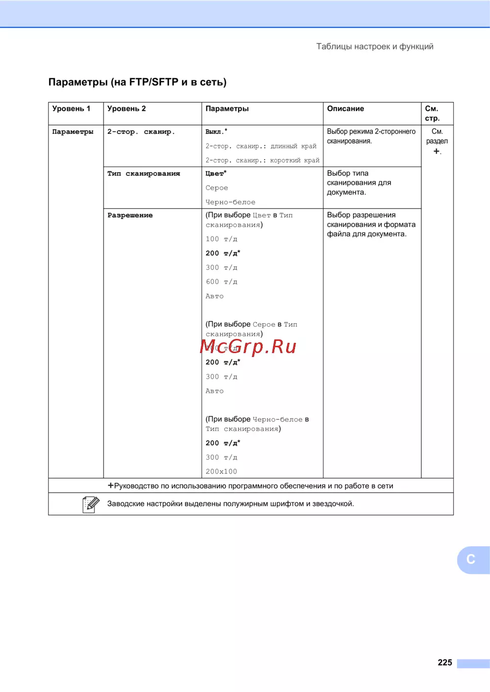 - Таблицы настроек и функций p.225