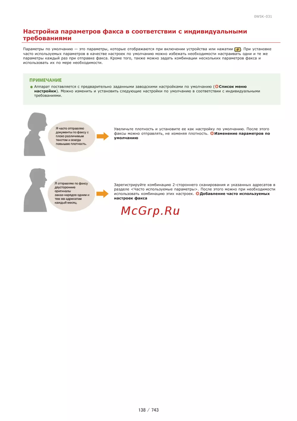0W5K 031 Настройка параметров факса в соответствии с индивидуальными требованиями Параметры по умолчанию это параметры которые отображаются при включении устройства или нажатии При установке часто используемых параметров в качестве настроек по умолчанию можно избежать необходимости настраивать одни и те же параметры каждый раз при отправке факса Кроме того также можно задать комбинации нескольких параметров факса и использовать их по мере необходимости ПРИМЕЧАНИЕ Аппарат поставляется с предварительно заданными заводскими настройками по умолчанию ССписок меню настройки Можно изменить и установить следующие настройки по умолчанию в соответствии с индивидуальными требованиями Я часто отправляю документы по факсу с плохо различимым текстом и всегда повышаю плотность Я отправляю по факсу двусторонние оригиналы заказ нарядоа одним и тем же адресатам каждый месяц Увеличьте плотность и установите ее как настройку по умолчанию После этого факсы можно отправлять не изменяя плотность О Изменение параметров по умолчанию Зарегистрируйте комбинацию 2 стороннего сканирования и указанных адресатов в разделе Часто используемые параметры После этого можно при необходимости использовать комбинацию этих настроек СДобавление часто используемых настроек факса 138 743