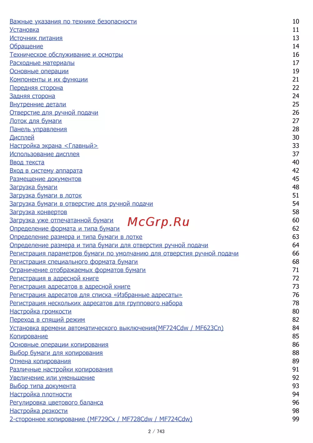 Важные указания по технике безопасности Установка Источник питания Обращение Техническое обслуживание и осмотры Расходные материалы Основные операции Компоненты и их функции Передняя сторона Задняя сторона Внутренние детали Отверстие для ручной подачи Лоток для бумаги Панель управления Дисплей Настройка экрана Главный Использование дисплея Ввод текста Вход в систему аппарата Размещение документов Загрузка бумаги Загрузка бумаги в лоток Загрузка бумаги в отверстие для ручной подачи Загрузка конвертов Загрузка уже отпечатанной бумаги Определение формата и типа бумаги Определение размера и типа бумаги в лотке Определение размера и типа бумаги для отверстия ручной подачи Регистрация параметров бумаги по умолчанию для отверстия ручной подачи Регистрация специального формата бумаги Ограничение отображаемых форматов бумаги Регистрация в адресной книге Регистрация адресатов в адресной книге Регистрация адресатов для списка Избранные адресаты Регистрация нескольких адресатов для группового набора Настройка громкости Переход в спящий режим Установка времени автоматического выключeния MF724Cdw МЕ623Сп Копирование Основные операции копирования Выбор бумаги для копирования Отмена копирования Различные настройки копирования Увеличение или уменьшение Выбор типа документа Настройка плотности Регулировка цветового баланса Настройка резкости 2 стороннее копирование МЕ729Сх MF728Cclw MF724Cclw 2 743 10 И 13 14 16 17 19 21 22 24 25 26 27 28 30 33 37 40 42 45 48 51 54 58 60 62 63 64 66 68 71 72 73 76 78 80 82 84 85 86 88 89 91 92 93 94 96 98 99