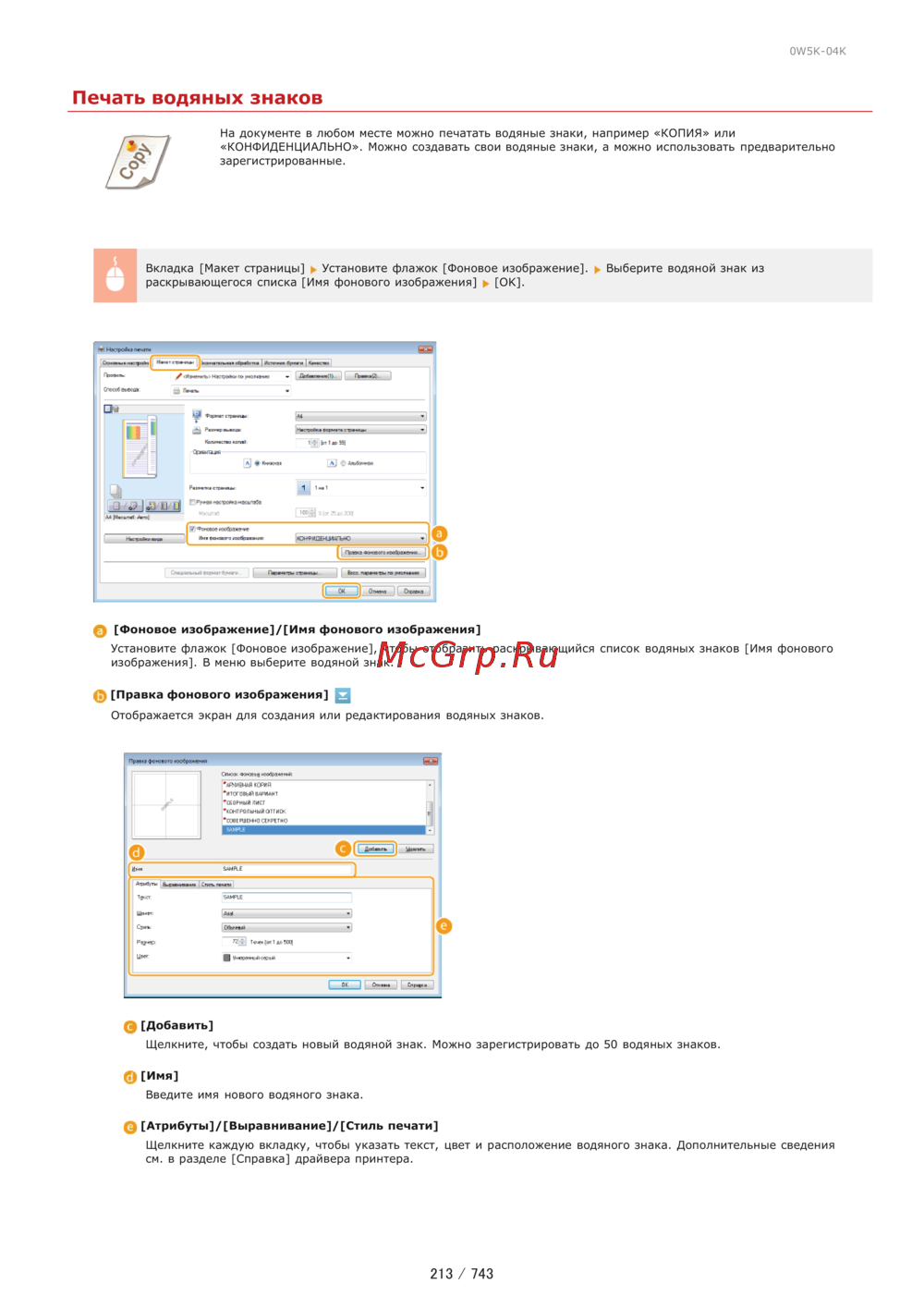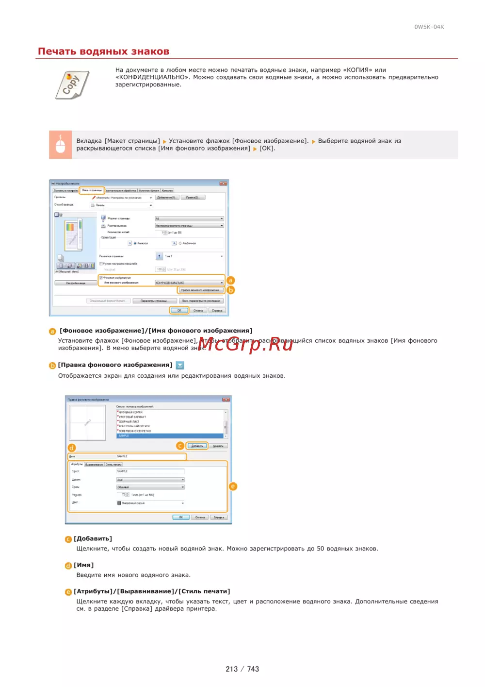 0W5K 04K Печать водяных знаков На документе в любом месте можно печатать водяные знаки например КОПИЯ или КОНФИДЕНЦИАЛЬНО Можно создавать свои водяные знаки а можно использовать предварительно зарегистрированные Н Вкладка Макет страницы Установите флажок Фоновое изображение Выберите водяной знак из раскрывающегося списка Имя фонового изображения ОК 0 Фоновое изображение Имя фонового изображения Установите флажок Фоновое изображение чтобы отобразить раскрывающийся список водяных знаков Имя фонового изображения В меню выберите водяной знак ф Правка фонового изображения а Отображается экран для создания или редактирования водяных знаков Добавить Щелкните чтобы создать новый водяной знак Можно зарегистрировать до 50 водяных знаков Имя Введите имя нового водяного знака Атрибуты Выравнивание Стиль печати Щелкните каждую вкладку чтобы указать текст цвет и расположение водяного знака Дополнительные сведения см в разделе Справка драйвера принтера 213 743