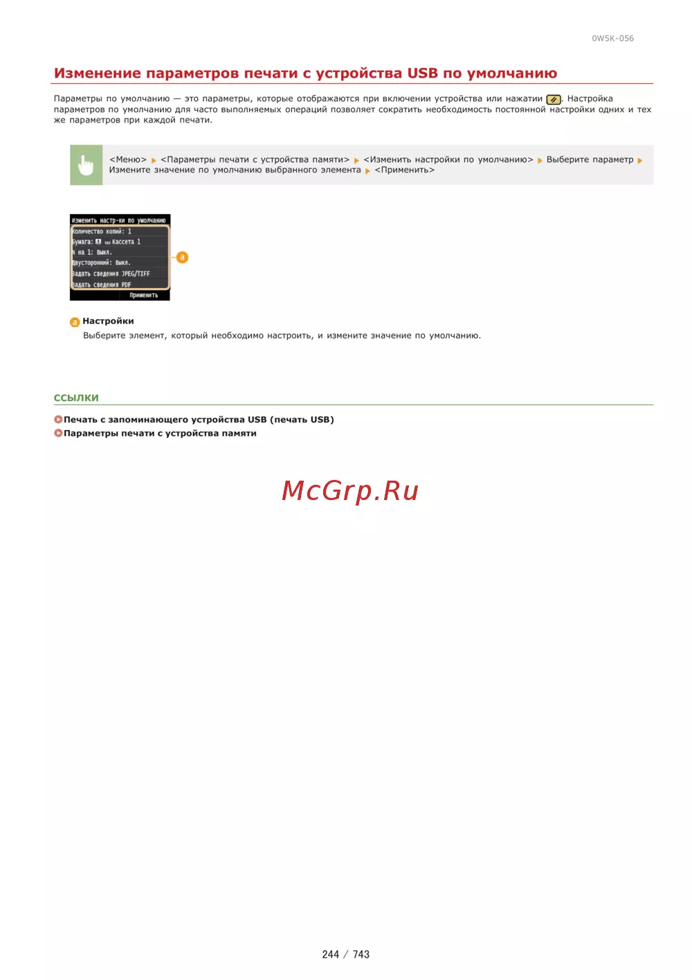 0W5K 056 Изменение параметров печати с устройства USB по умолчанию Параметры по умолчанию это параметры которые отображаются при включении устройства или нажатии Настройка параметров по умолчанию для часто выполняемых операций позволяет сократить необходимость постоянной настройки одних и тех же параметров при каждой печати Меню к Параметры печати с устройства памяти Изменить настройки по умолчанию к Выберите параметр Измените значение по умолчанию выбранного элемента Применить Настройки Выберите элемент который необходимо настроить и измените значение по умолчанию ССЫЛКИ ОПечать с запоминающего устройства USB печать USB ОПараметры печати с устройства памяти 244 743