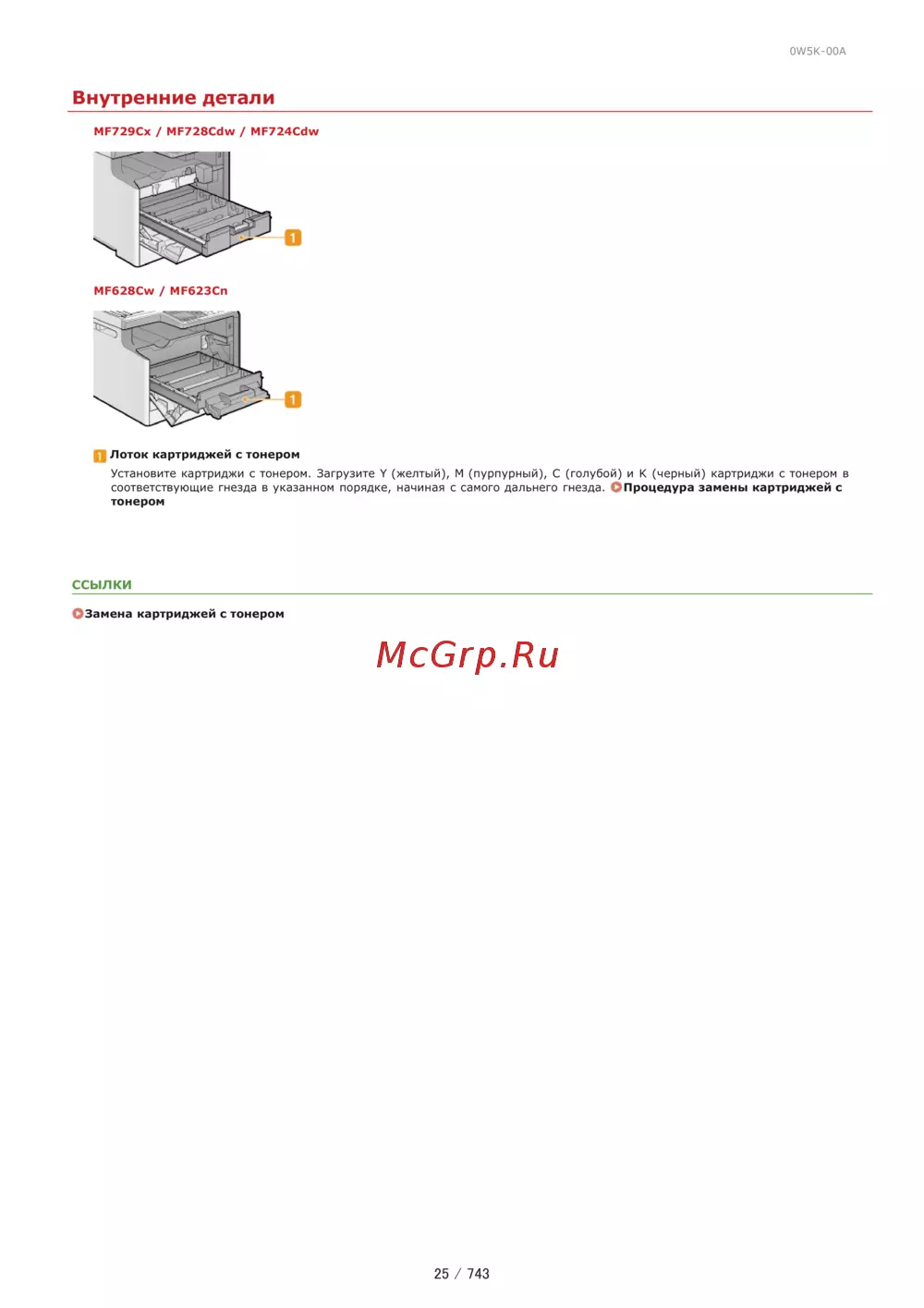 0W5K 00A Внутренние детали MFб28Cw МР623СП Лоток картриджей с тонером Установите картриджи стонером Загрузите У желтый М пурпурный С голубой и К черный картриджи стонером в соответствующие гнезда в указанном порядке начиная с самого дальнего гнезда О Процедура замены картриджей с тонером ССЫЛКИ ОЗамена картриджей с тонером 25 743