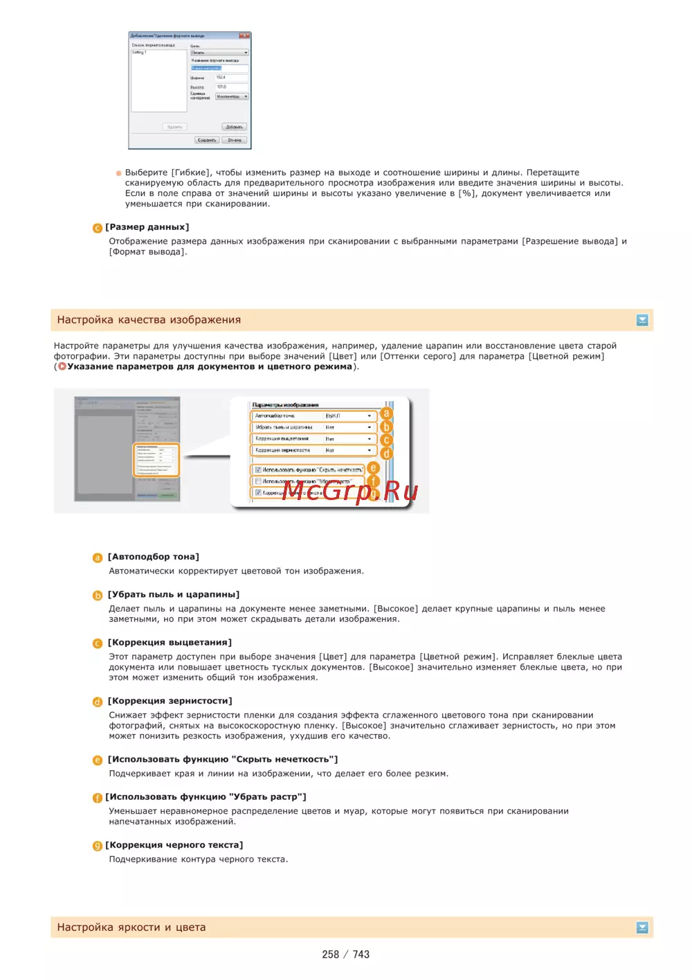 Выберите Гибкие чтобы изменить размер на выходе и соотношение ширины и длины Перетащите сканируемую область для предварительного просмотра изображения или введите значения ширины и высоты Если в поле справа от значений ширины и высоты указано увеличение в документ увеличивается или уменьшается при сканировании Размер данных Отображение размера данных изображения при сканировании с выбранными параметрами Разрешение вывода и Формат вывода Настройка качества изображения В Настройте параметры для улучшения качества изображения например удаление царапин или восстановление цвета старой фотографии Эти параметры доступны при выборе значений Цвет или Оттенки серого для параметра Цветной режим ОУказание параметров для документов и цветного режима Автоподбор тона Автоматически корректирует цветовой тон изображения и Убрать пыль и царапины Делает пыль и царапины на документе менее заметными Высокое делает крупные царапины и пыль менее заметными но при этом может скрадывать детали изображения Коррекция выцветания Этот параметр доступен при выборе значения Цвет для параметра Цветной режим Исправляет блеклые цвета документа или повышает цветность тусклых документов Высокое значительно изменяет блеклые цвета но при этом может изменить общий тон изображения 3 Коррекция зернистости Снижает эффект зернистости пленки для создания эффекта сглаженного цветового тона при сканировании фотографий снятых на высокоскоростную пленку Высокое значительно сглаживает зернистость но при этом может понизить резкость изображения ухудшив его качество Использовать функцию Скрыть нечеткость Подчеркивает края и линии на изображении что делает его более резким Использовать функцию Убрать растр Уменьшает неравномерное распределение цветов и муар которые могут появиться при сканировании напечатанных изображений Коррекция черного текста Подчеркивание контура черного текста Настройка яркости и цвета 258 743