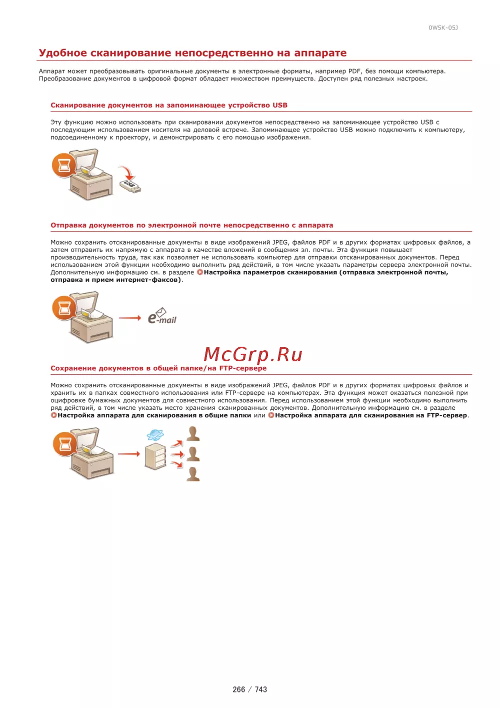 0W5K 05J Удобное сканирование непосредственно на аппарате Аппарат может преобразовывать оригинальные документы в электронные форматы например PDF без помощи компьютера Преобразование документов в цифровой формат обладает множеством преимуществ Доступен ряд полезных настроек Сканирование документов на запоминающее устройство USB Эту функцию можно использовать при сканировании документов непосредственно на запоминающее устройство USB с последующим использованием носителя на деловой встрече Запоминающее устройство USB можно подключить к компьютеру подсоединенному к проектору и демонстрировать с его помощью изображения Отправка документов по электронной почте непосредственно с аппарата Можно сохранить отсканированные документы в виде изображений JPEG файлов PDF и в других форматах цифровых файлов а затем отправить их напрямую с аппарата в качестве вложений в сообщения эл почты Эта функция повышает производительность труда так как позволяет не использовать компьютер для отправки отсканированных документов Перед использованием этой функции необходимо выполнить ряд действий в том числе указать параметры сервера электронной почты Дополнительную информацию см в разделе ОНастройка параметров сканирования отправка электронной почты отправка и прием интернет факсов ч Ч С тан Сохранение документов в общей папке на FTP сервере Можно сохранить отсканированные документы в виде изображений JPEG файлов PDF и в других форматах цифровых файлов и хранить их в папках совместного использования или FTP сервере на компьютерах Эта функция может оказаться полезной при оцифровке бумажных документов для совместного использования Перед использованием этой функции необходимо выполнить ряд действий в том числе указать место хранения сканированных документов Дополнительную информацию см в разделе ОНастройка аппарата для сканирования в общие папки или ОНастройка аппарата для сканирования на FTP сервер 266 743