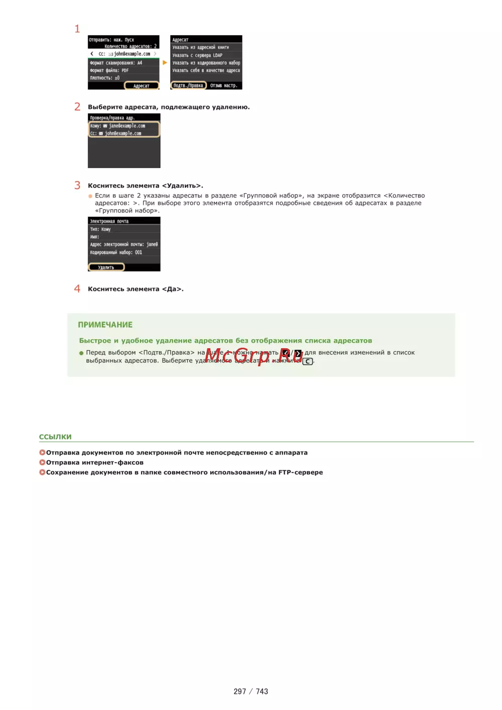1 2 Выберите адресата подлежащего удалению 3 Коснитесь элемента Удалить Если в шаге 2 указаны адресаты в разделе Групповой набор на экране отобразится Количество адресатов При выборе этого элемента отобразятся подробные сведения об адресатах в разделе Групповой набор Электронная почта___________________ Тип кому пп Адрес электронной почты кодированный набор 001 4 Коснитесь элемента Да ПРИМЕЧАНИЕ Быстрое и удобное удаление адресатов без отображения списка адресатов Перед выбором Подтв Правка на шаге 1 можно нажать н для внесения изменений в список выбранных адресатов Выберите удаляемого адресата и нажмите С ССЫЛКИ Отправка документов по электронной почте непосредственно с аппарата Отправка интернет факсов Сохранение документов в папке совместного использования на ЕТР сервере 297 743
