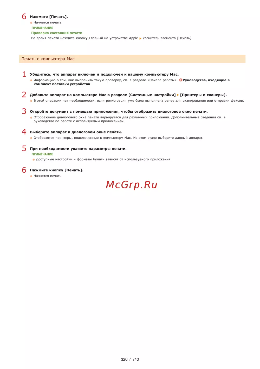 0 Нажмите Печать Начнется печать ПРИМЕЧАНИЕ Проверка состояния печати Во время печати нажмите кнопку Главный на устройстве Apple коснитесь элемента Печать Печать с компьютера Мас Убедитесь что аппарат включен и подключен к вашему компьютеру Мас Информацию о том как выполнить такую проверку см в разделе Начало работы Руководства входящие в комплект поставки устройства 2 Добавьте аппарат на компьютере Мас в разделе Системные настройки Принтеры и сканеры В этой операции нет необходимости если регистрация уже была выполнена ранее для сканирования или отправки факсов 3 Откройте документ с помощью приложения чтобы отобразить диалоговое окно печати Отображение диалогового окна печати варьируется для различных приложений Дополнительные сведения см в руководстве по работе с используемым приложением 4 Выберите аппарат в диалоговом окне печати Отобразятся принтеры подключенные к компьютеру Мас На этом этапе выберите данный аппарат 5 При необходимости укажите параметры печати ПРИМЕЧАНИЕ Доступные настройки и форматы бумаги зависят от используемого приложения 0 Нажмите кнопку Печать Начнется печать 320 743