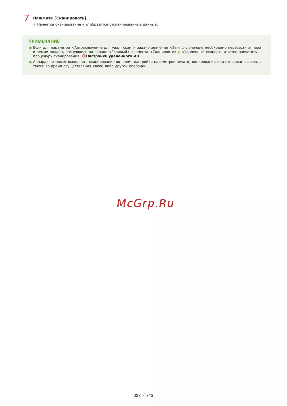 Нажмите Сканировать Начнется сканирование и отобразятся отсканированные данные ПРИМЕЧАНИЕ Если для параметра Автовключение для удал скан задано значение Выкл вначале необходимо перевести аппарат в режим онлайн коснувшись на экране Главный элемента Сканиров е Удаленный сканер а затем запустить процедуру сканирования О Настройки удаленного ИП Аппарат не может выполнять сканирование во время настройки параметров печати копирования или отправки факсов а также во время осуществления какой либо другой операции 322 743