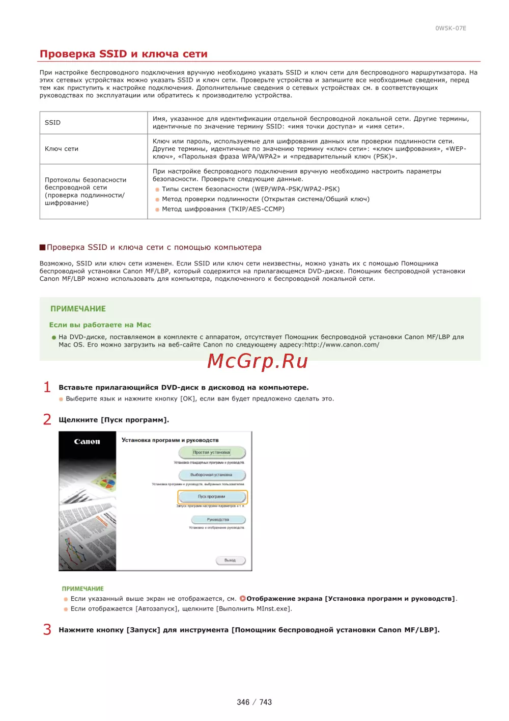 0W5K 07E Проверка SSID и ключа сети При настройке беспроводного подключения вручную необходимо указать SSID и ключ сети для беспроводного маршрутизатора На этих сетевых устройствах можно указать SSID и ключ сети Проверьте устройства и запишите все необходимые сведения перед тем как приступить к настройке подключения Дополнительные сведения о сетевых устройствах см в соответствующих руководствах по эксплуатации или обратитесь к производителю устройства SSID Имя указанное для идентификации отдельной беспроводной локальной сети Другие термины идентичные по значение термину SSID имя точки доступа и имя сети Ключ сети Ключ или пароль используемые для шифрования данных или проверки подлинности сети Другие термины идентичные по значению термину ключ сети ключ шифрования WEPключ Парольная фраза WPA WPA2 и предварительный ключ PSK Протоколы безопасности беспроводной сети проверка подлинности шифрование При настройке беспроводного подключения вручную необходимо настроить параметры безопасности Проверьте следующие данные Типы систем безопасности WEP WPA PSK WPA2 PSK Метод проверки подлинности Открытая система Общий ключ Метод шифрования TKIP AES CCMP Проверка SSID и ключа сети с помощью компьютера Возможно SSID или ключ сети изменен Если SSID или ключ сети неизвестны можно узнать их с помощью Помощника беспроводной установки Canon MF LBP который содержится на прилагающемся DVD диске Помощник беспроводной установки Canon MF LBP можно использовать для компьютера подключенного к беспроводной локальной сети ПРИМЕЧАНИЕ Если вы работаете на Мас На DVD диске поставляемом в комплекте с аппаратом отсутствует Помощник беспроводной установки Canon MF LBP для Mac OS Его можно загрузить на веб сайте Canon по следующему адресу http www canon сот 1 Вставьте прилагающийся DVD диск в дисковод на компьютере Выберите язык и нажмите кнопку ОК если вам будет предложено сделать это 2 Щелкните Пуск программ ПРИМЕЧАНИЕ Если указанный выше экран не отображается см Отображение экрана Установка программ и руководств Если отображается Автозапуск щелкните Выполнить MInst exe Нажмите кнопку Запуск для инструмента Помощник беспроводной установки Canon MF LBP 346 743