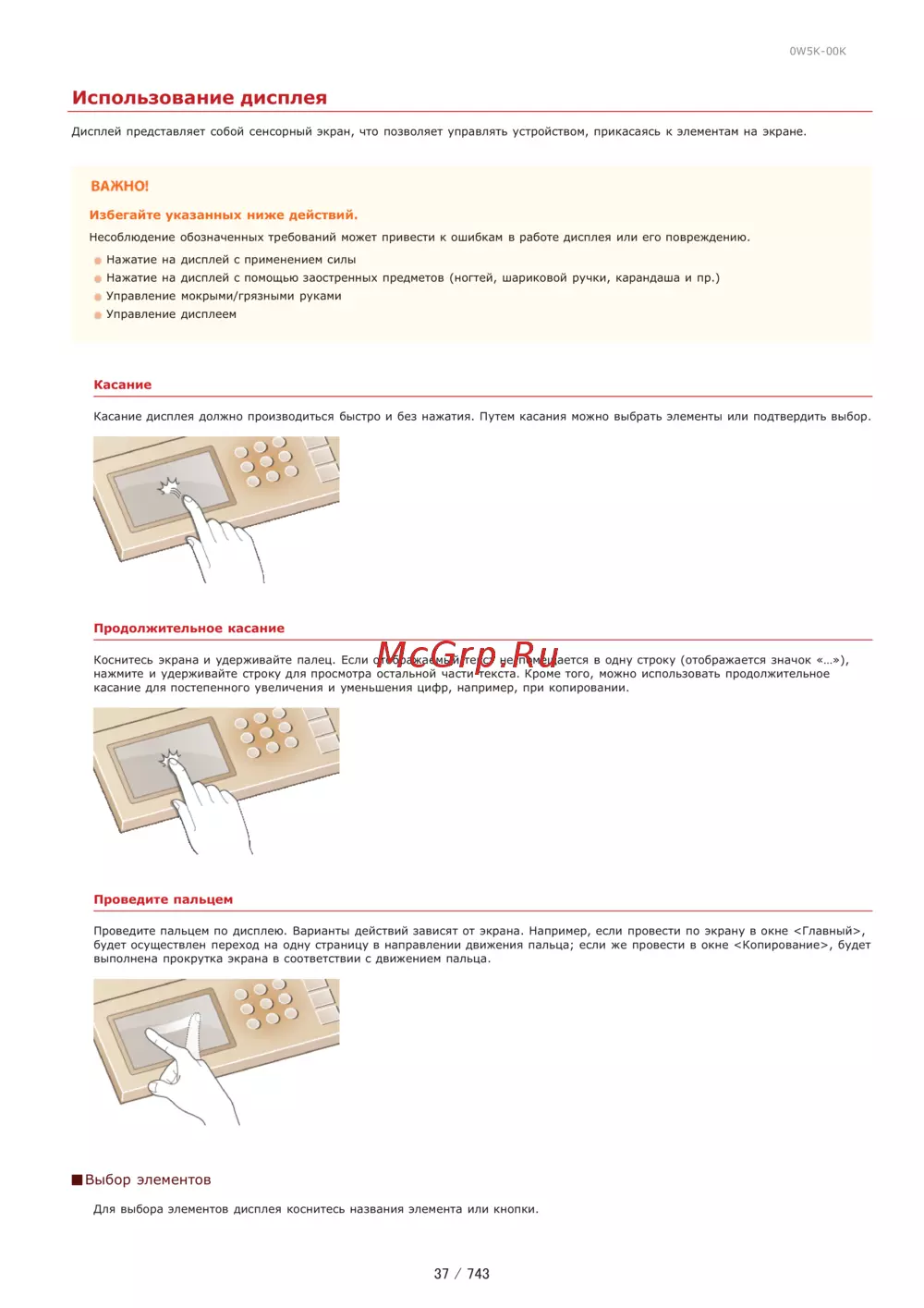 0W5K 00K Использование дисплея Дисплей представляет собой сенсорный экран что позволяет управлять устройством прикасаясь к элементам на экране ВАЖНО Избегайте указанных ниже действий Несоблюдение обозначенных требований может привести к ошибкам в работе дисплея или его повреждению Нажатие на дисплей с применением силы Нажатие на дисплей с помощью заостренных предметов ногтей шариковой ручки карандаша и пр Управление мокрыми грязными руками Управление дисплеем Касание Касание дисплея должно производиться быстро и без нажатия Путем касания можно выбрать элементы или подтвердить выбор Продолжительное касание Коснитесь экрана и удерживайте палец Если отображаемый текст не помещается в одну строку отображается значок нажмите и удерживайте строку для просмотра остальной части текста Кроме того можно использовать продолжительное касание для постепенного увеличения и уменьшения цифр например при копировании Проведите пальцем Проведите пальцем по дисплею Варианты действий зависят от экрана Например если провести по экрану в окне Главный будет осуществлен переход на одну страницу в направлении движения пальца если же провести в окне Копирование будет выполнена прокрутка экрана в соответствии с движением пальца Выбор элементов Для выбора элементов дисплея коснитесь названия элемента или кнопки 37 743