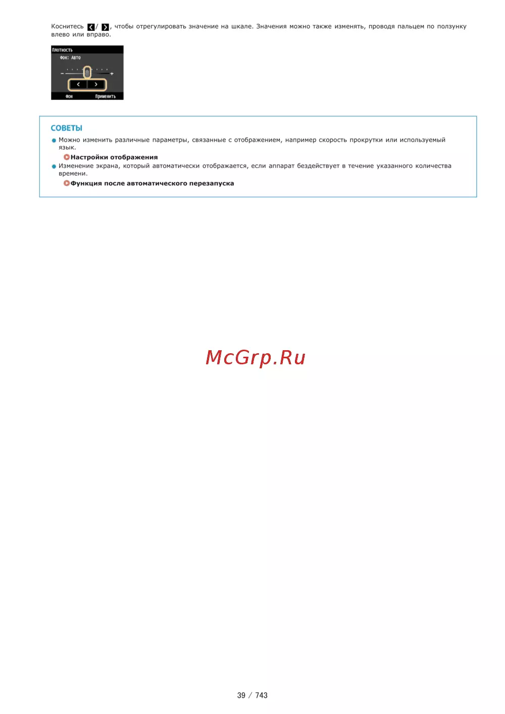 Коснитесь Н й чтобы отрегулировать значение на шкале Значения можно также изменять проводя пальцем по ползунку влево или вправо СОВЕТЫ Можно изменить различные параметры связанные с отображением например скорость прокрутки или используемый язык ОНастройки отображения Изменение экрана который автоматически отображается если аппарат бездействует в течение указанного количества времени ОФункция после автоматического перезапуска 39 743