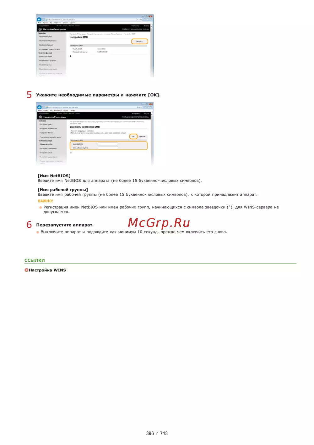 5 Укажите необходимые параметры и нажмите ОК Имя NetBIOS Введите имя NetBIOS для аппарата не более 15 буквенно числовых символов Имя рабочей группы Введите имя рабочей группы не более 15 буквенно числовых символов к которой принадлежит аппарат ВАЖНО Регистрация имен NetBIOS или имен рабочих групп начинающихся с символа звездочки для WINS сервера не допускается Перезапустите аппарат Выключите аппарат и подождите как минимум 10 секунд прежде чем включить его снова ССЫЛКИ ОНастройка WINS 396 743