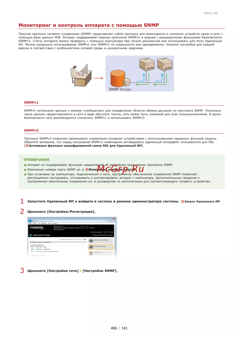 0W5K 08J Мониторинг и контроль аппарата с помощью SNMP Простой протокол сетевого управления SNMP представляет собой протокол для мониторинга и контроля устройств связи в сети с помощью базы данных MIB Аппарат поддерживает версию протокола SNMPvl и версию с расширенными функциями безопасности SNMPv3 Статус аппарата можно проверить с помощью компьютера при печати документов или использовать для этого Удаленный ИП Можно разрешить использование SNMPvl или SNMPv3 по отдельности или одновременно Укажите настройки для каждой версии в соответствии с особенностями сетевой среды и конкретными задачами SNMP Manager SNMPvl SNMPvl использует данные с именем сообщество для определения области обмена данными по протоколу SNMP Поскольку такие данные предоставляются в сети в виде обычного текста сеть может быть уязвимой для атак злоумышленников В целях безопасности сети рекомендуется отключить SNMPvl и использовать SNMPv3 SNMPv3 Протокол SNMPv3 позволяет реализовать управление сетевыми устройствами с использованием надежных функций защиты Обратите внимание что перед настройкой SNMPv3 необходимо активировать удаленный интерфейс пользователя для SSL ОАктивация функции зашифрованной связи SSL для Удаленный ИП ПРИМЕЧАНИЕ Аппарат не поддерживает функцию уведомлений об аварийном прерывании протокола SNMP Изменение номера порта SNMP см в СИзменение номеров портов При установке на компьютере подключенном к сети программное обеспечение управления SNMP позволяет дистанционно настраивать отслеживать и контролировать аппарат с компьютера Дополнительные сведения о программном обеспечении управления см в руководстве по эксплуатации для соответствующего сетевого устройства 1 Запустите Удаленный ИП и войдите в систему в режиме администратора системы СЗапуск Удаленного ИП Щелкните Настройки Регистрация 3 Щелкните Настройки сети Настройки SNMP 406 743