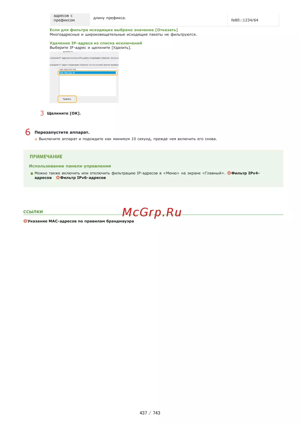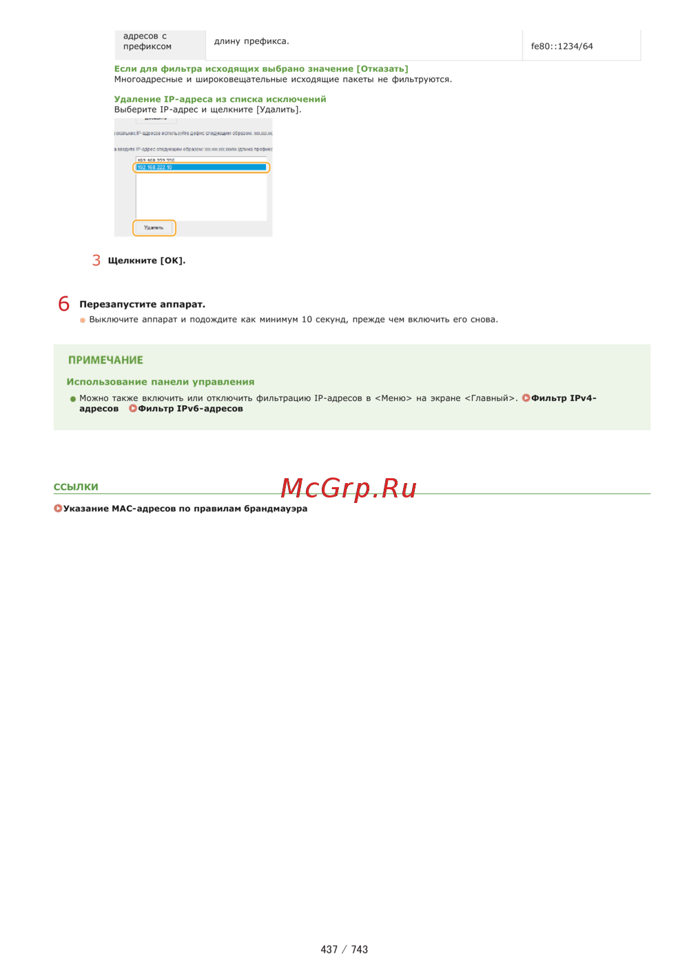 адресов с префиксом длину префикса Ге80 1234 64 Если для фильтра исходящих выбрано значение Отказать Многоадресные и широковещательные исходящие пакеты не фильтруются Удаление 1Р адреса из списка исключений Выберите 1Р адрес и щелкните Удалить скол км 1Р айй о 1 иопогыуйте оеагк слш 1кщим образен а маните р ашвсгпадкшно всезэри гачкох длина пвеакк 3 Щелкните ОК 6 Перезапустите аппарат Выключите аппарат и подождите как минимум 10 секунд прежде чем включить его снова ПРИМЕЧАНИЕ Использование панели управления Можно также включить или отключить фильтрацию 1Р адресов в Меню на экране Главный Фильтр 1РУ4адресов Фильтр IPv6 aдpecoв ССЫЛКИ Указание МАС адресов по правилам брандмауэра 437 743