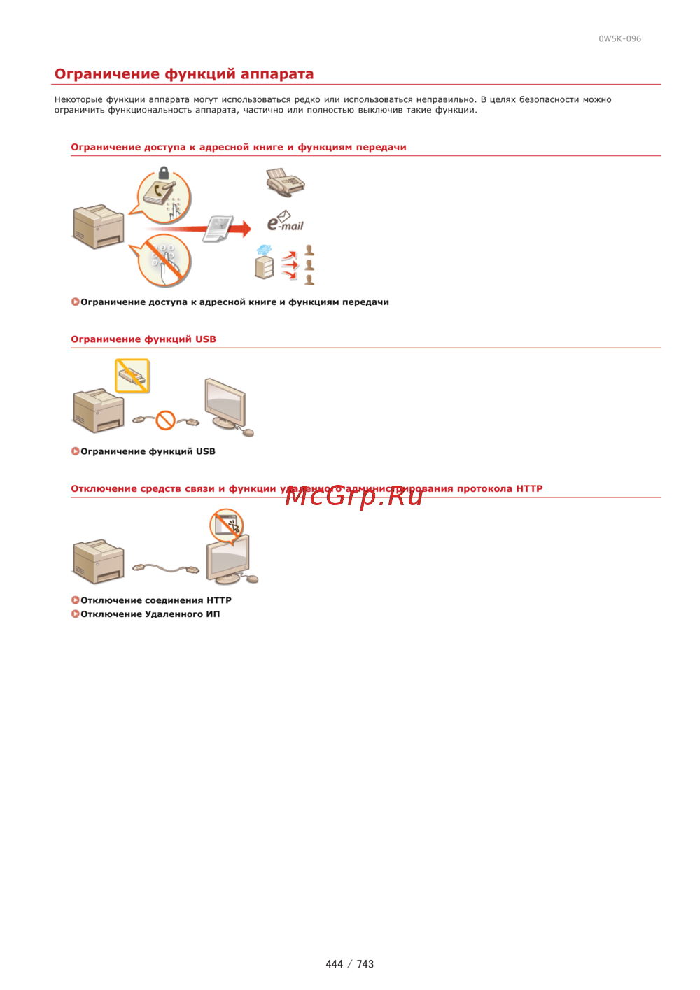 0W5K 096 Ограничение функций аппарата Некоторые функции аппарата могут использоваться редко или использоваться неправильно В целях безопасности можно ограничить функциональность аппарата частично или полностью выключив такие функции Ограничение доступа к адресной книге и функциям передачи ООграничение доступа к адресной книге и функциям передачи Ограничение функций USB ООграничение функций USB Отключение средств связи и функции удаленного администрирования протокола HTTP ООтключение соединения HTTP ООтключение Удаленного ИП 444 743