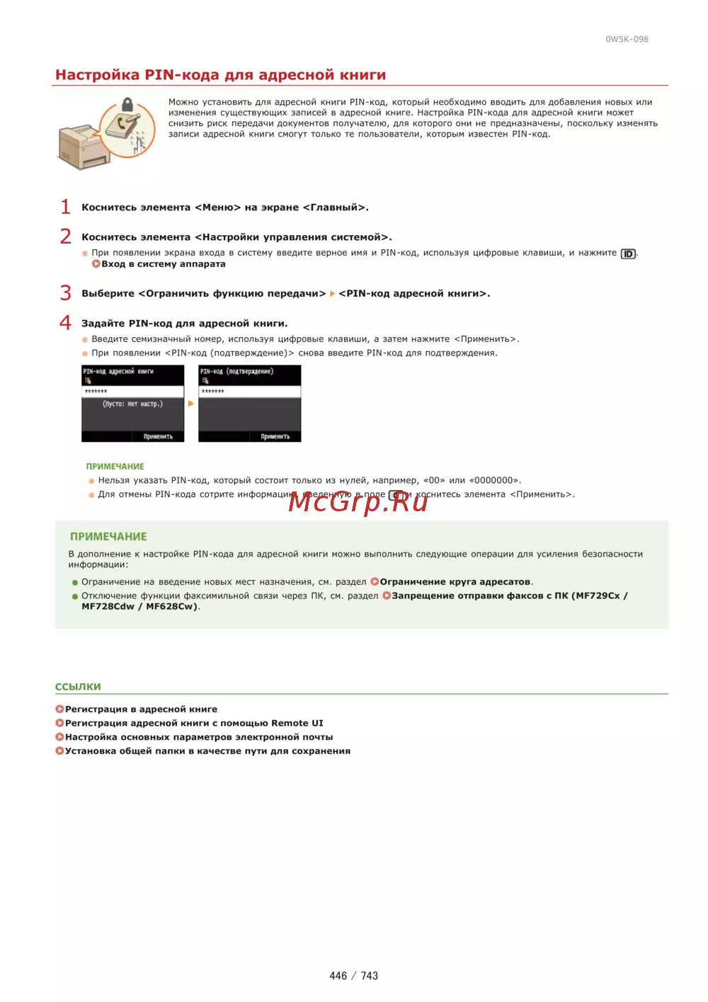 0W5K 098 Настройка PIN кода для адресной книги Можно установить для адресной книги РЖ код который необходимо вводить для добавления новых или изменения существующих записей в адресной книге Настройка РЖ кода для адресной книги может снизить риск передачи документов получателю для которого они не предназначены поскольку изменять записи адресной книги смогут только те пользователи которым известен РЖ код Коснитесь элемента Меню на экране Главный Коснитесь элемента Настройки управления системой в При появлении экрана входа в систему введите верное имя и РЖ код используя цифровые клавиши и нажмите QD С Вход в систему аппарата Выберите Ограничить функцию передачи PIN KOA адресной книги Задайте PIN код для адресной книги Введите семизначный номер используя цифровые клавиши а затем нажмите Применить При появлении РЖ код подтверждение снова введите РЖ код для подтверждения ПРИМЕЧАНИЕ Нельзя указать РЖ код который состоит только из нулей например 00 или 0000000 Для отмены РЖ кода сотрите информацию введенную в поле с и коснитесь элемента Применить ПРИМЕЧАНИЕ В дополнение к настройке РЖ кода для адресной книги можно выполнить следующие операции для усиления безопасности информации Ограничение на введение новых мест назначения см раздел ООграничение круга адресатов Отключение функции факсимильной связи через ПК см раздел СЗапрещение отправки факсов с ПК МР729СХ MF728Cdw MF628Cw ССЫЛКИ О Регистрация в адресной книге СРегистрация адресной книги с помощью Remote UI ОНастройка основных параметров электронной почты ОУстановка общей папки в качестве пути для сохранения 446 743