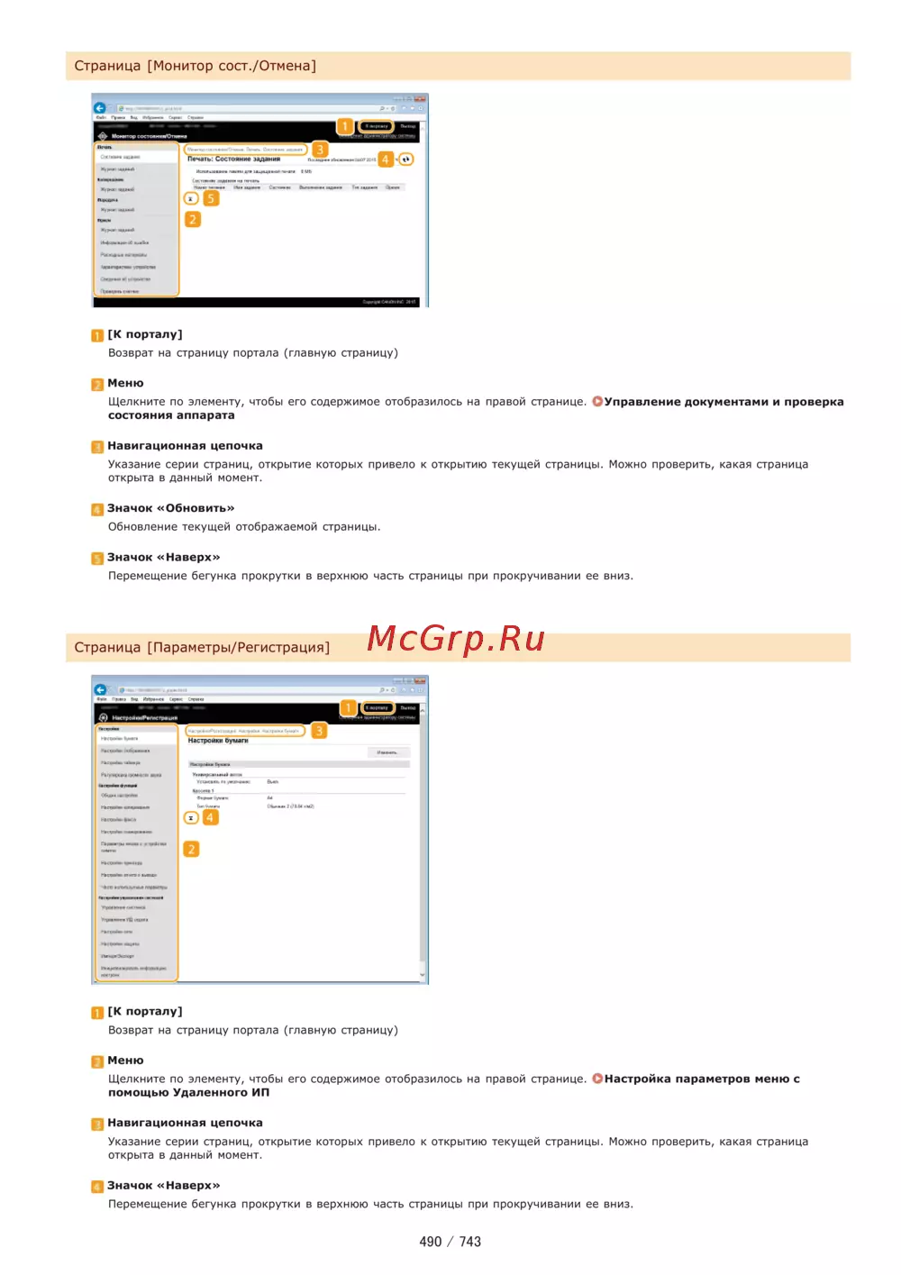 Страница Монитор сост Отмена О К порталу Возврат на страницу портала главную страницу Меню Щелкните по элементу чтобы его содержимое отобразилось на правой странице Управление документами и проверка состояния аппарата Навигационная цепочка Указание серии страниц открытие которых привело к открытию текущей страницы Можно проверить какая страница открыта в данный момент Значок Обновить Обновление текущей отображаемой страницы Значок Наверх Перемещение бегунка прокрутки в верхнюю часть страницы при прокручивании ее вниз Страница Параметры Регистрация К порталу Возврат на страницу портала главную страницу Меню Щелкните по элементу чтобы его содержимое отобразилось на правой странице Настройка параметров меню с помощью Удаленного ИП Навигационная цепочка Указание серии страниц открытие которых привело к открытию текущей страницы Можно проверить какая страница открыта в данный момент Значок Наверх Перемещение бегунка прокрутки в верхнюю часть страницы при прокручивании ее вниз 490 743