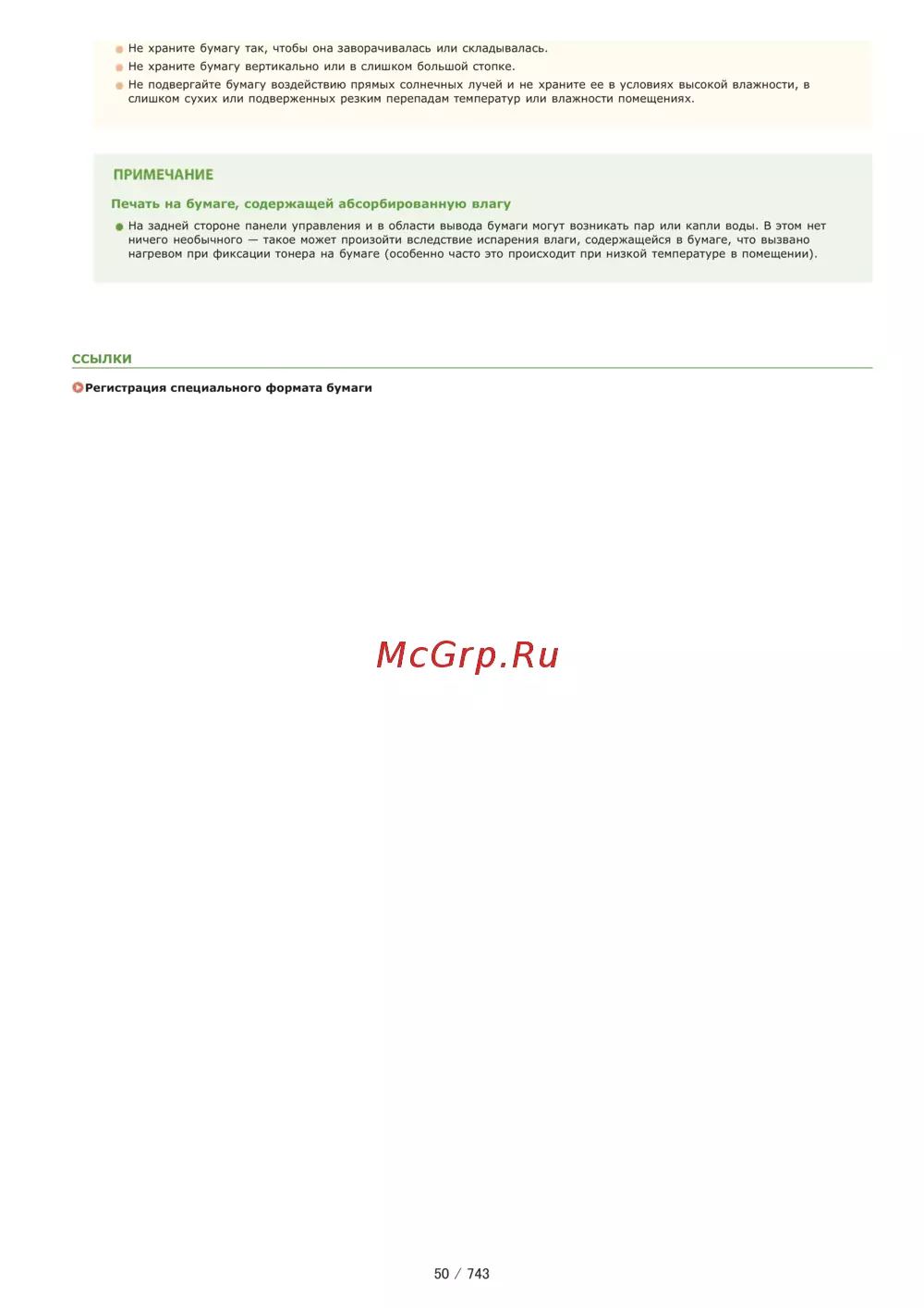 Не храните бумагу так чтобы она заворачивалась или складывалась Не храните бумагу вертикально или в слишком большой стопке Не подвергайте бумагу воздействию прямых солнечных лучей и не храните ее в условиях высокой влажности в слишком сухих или подверженных резким перепадам температур или влажности помещениях ПРИМЕЧАНИЕ Печать на бумаге содержащей абсорбированную влагу На задней стороне панели управления и в области вывода бумаги могут возникать пар или капли воды В этом нет ничего необычного такое может произойти вследствие испарения влаги содержащейся в бумаге что вызвано нагревом при фиксации тонера на бумаге особенно часто это происходит при низкой температуре в помещении ССЫЛКИ Регистрация специального формата бумаги 50 743