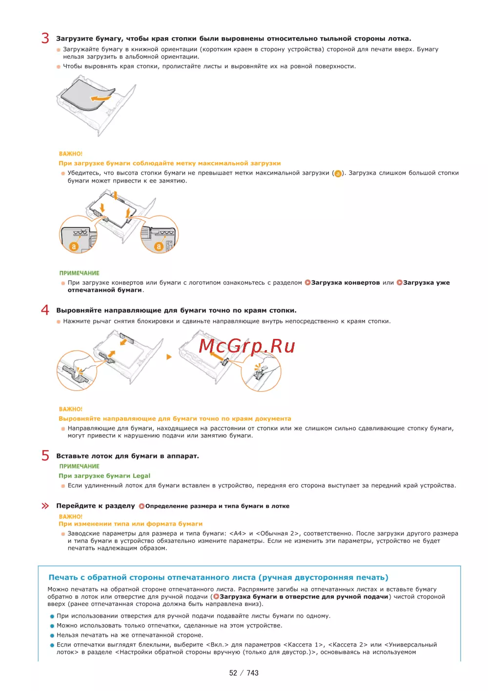 Загрузите бумагу чтобы края стопки были выровнены относительно тыльной стороны лотка Загружайте бумагу в книжной ориентации коротким краем в сторону устройства стороной для печати вверх Бумагу нельзя загрузить в альбомной ориентации Чтобы выровнять края стопки пролистайте листы и выровняйте их на ровной поверхности ВАЖНО При загрузке бумаги соблюдайте метку максимальной загрузки Убедитесь что высота стопки бумаги не превышает метки максимальной загрузки 0 Загрузка слишком большой стопки бумаги может привести к ее замятию ПРИМЕЧАНИЕ При загрузке конвертов или бумаги с логотипом ознакомьтесь с разделом ОЗагрузка конвертов или ОЗагрузка уже отпечатанной бумаги Выровняйте направляющие для бумаги точно по краям стопки Нажмите рычаг снятия блокировки и сдвиньте направляющие внутрь непосредственно к краям стопки ВАЖНО Выровняйте направляющие для бумаги точно по краям документа Направляющие для бумаги находящиеся на расстоянии от стопки или же слишком сильно сдавливающие стопку бумаги могут привести к нарушению подачи или замятию бумаги Вставьте лоток для бумаги в аппарат ПРИМЕЧАНИЕ При загрузке бумаги Legal Если удлиненный лоток для бумаги вставлен в устройство передняя его сторона выступает за передний край устройства Перейдите к разделу о Определение размера и типа бумаги в лотке ВАЖНО При изменении типа или формата бумаги Заводские параметры для размера и типа бумаги А4 и Обычная 2 соответственно После загрузки другого размера и типа бумаги в устройство обязательно измените параметры Если не изменить эти параметры устройство не будет печатать надлежащим образом Печать с обратной стороны отпечатанного листа ручная двусторонняя печать Можно печатать на обратной стороне отпечатанного листа Распрямите загибы на отпечатанных листах и вставьте бумагу обратно в лоток или отверстие для ручной подачи С Загрузка бумаги в отверстие для ручной подачи чистой стороной вверх ранее отпечатанная сторона должна быть направлена вниз При использовании отверстия для ручной подачи подавайте листы бумаги по одному Можно использовать только отпечатки сделанные на этом устройстве Нельзя печатать на же отпечатанной стороне Если отпечатки выглядят блеклыми выберите Вкл для параметров Кассета 1 Кассета 2 или Универсальный лоток в разделе Настройки обратной стороны вручную только для двустор основываясь на используемом 52 743
