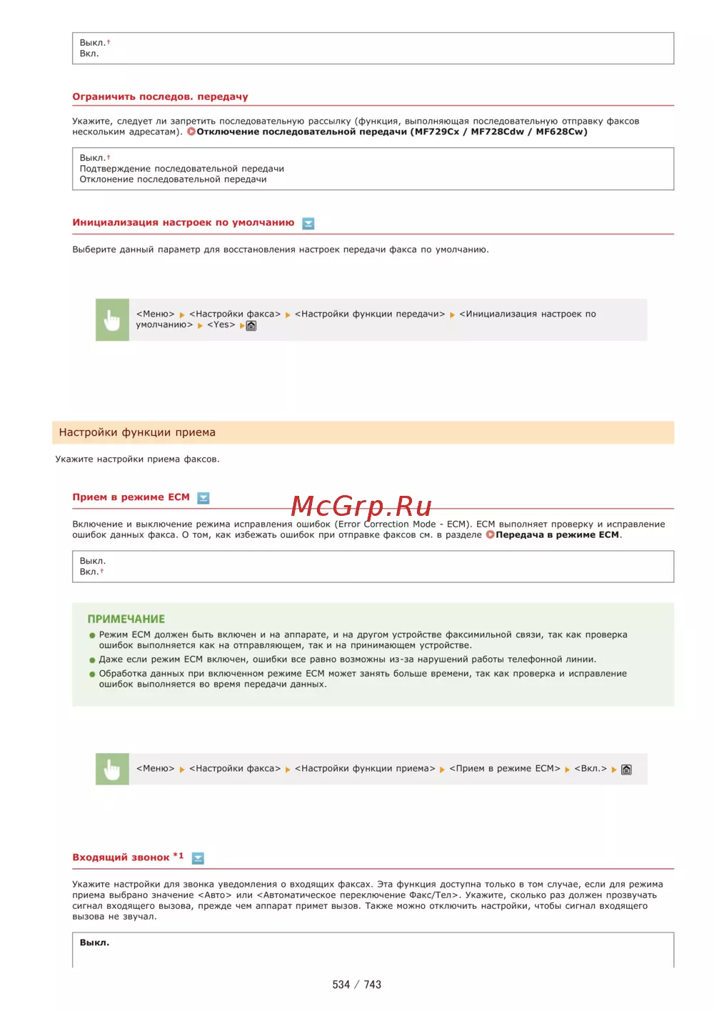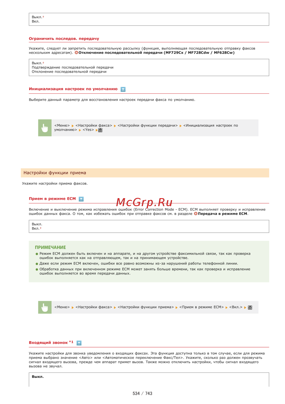 ВыклЛ Вкл Ограничить последов передачу Укажите следует ли запретить последовательную рассылку функция выполняющая последовательную отправку факсов нескольким адресатам Отключение последовательной передачи МЕ729СХ МР728СсЫ MF628Cw Выкл Подтверждение последовательной передачи Отклонение последовательной передачи Инициализация настроек по умолчанию Q Выберите данный параметр для восстановления настроек передачи факса по умолчанию Менк Настройки факса сНастройки функции передачи к Инициализация настроек по умолчанию Yes Настройки функции приема Укажите настройки приема факсов Прием в режиме ЕСМ S Включение и выключение режима исправления ошибок Error Correction Mode ЕСМ ЕСМ выполняет проверку и исправление ошибок данных факса О том как избежать ошибок при отправке факсов см в разделе Передача в режиме ЕСМ Выкл ВклЛ ПРИМЕЧАНИЕ Режим ЕСМ должен быть включен и на аппарате и на другом устройстве факсимильной связи так как проверка ошибок выполняется как на отправляющем так и на принимающем устройстве Даже если режим ЕСМ включен ошибки все равно возможны из за нарушений работы телефонной линии Обработка данных при включенном режиме ЕСМ может занять больше времени так как проверка и исправление ошибок выполняется во время передачи данных Меню Настройки факса сНастройки функции приема Прием в режиме ЕСМ Вкл Щ Входящий ЗВОНОК г Укажите настройки для звонка уведомления о входящих факсах Эта функция доступна только в том случае если для режима приема выбрано значение Авто или Автоматическое переключение Факс Тел Укажите сколько раз должен прозвучать сигнал входящего вызова прежде чем аппарат примет вызов Также можно отключить настройки чтобы сигнал входящего вызова не звучал Выкл 534 743