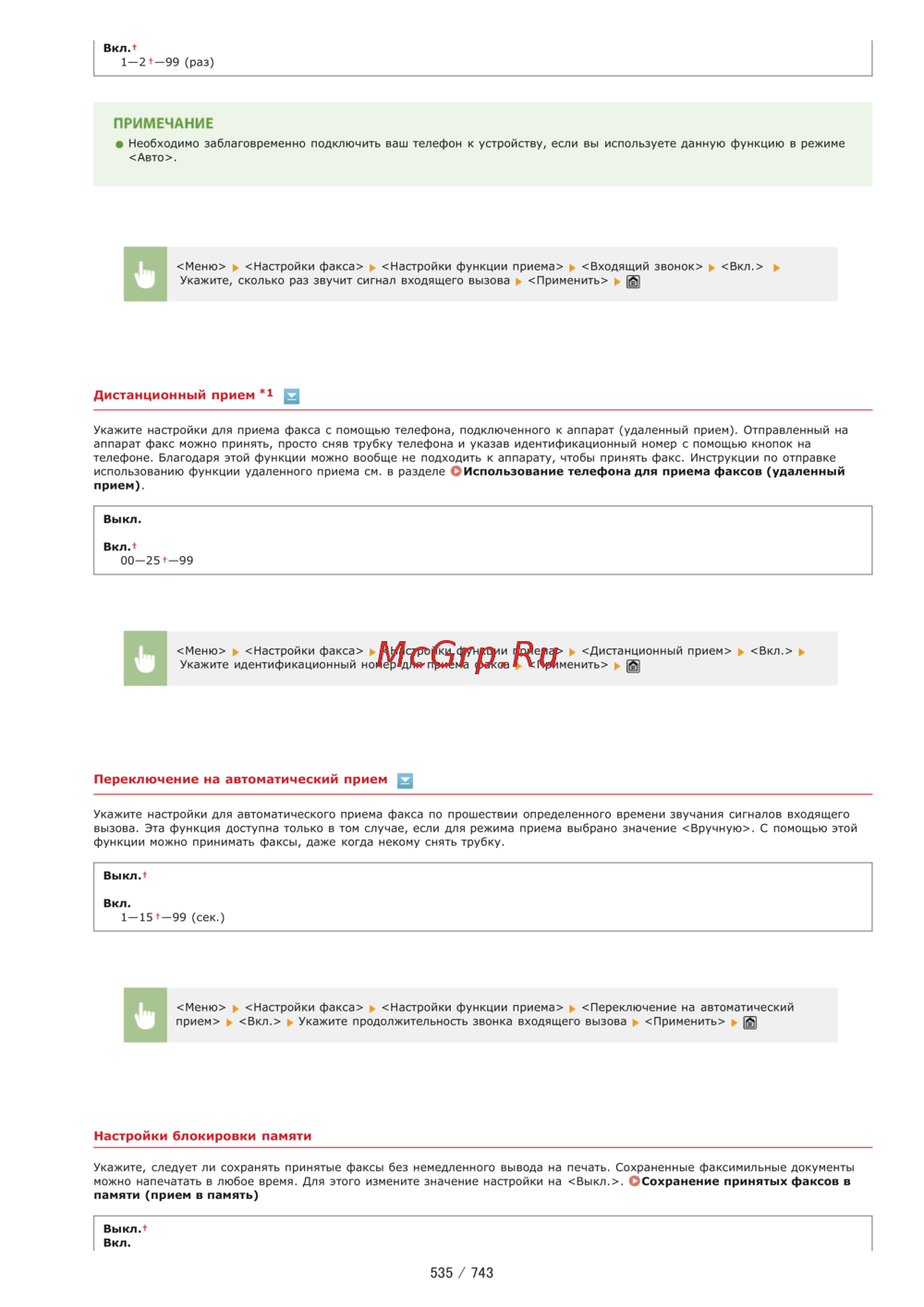 Вкл 1 2 99 раз ПРИМЕЧАНИЕ Необходимо заблаговременно подключить ваш телефон к устройству если вы используете данную функцию в режиме Авто Менк Настройки факса сНастройки функции приема Входящий звонок Вкл к Укажите сколько раз звучит сигнал входящего вызова Применить Щ Дистанционный прием 1 Укажите настройки для приема факса с помощью телефона подключенного к аппарат удаленный прием Отправленный на аппарат факс можно принять просто сняв трубку телефона и указав идентификационный номер с помощью кнопок на телефоне Благодаря этой функции можно вообще не подходить к аппарату чтобы принять факс Инструкции по отправке использованию функции удаленного приема см в разделе О Использование телефона для приема факсов удаленный прием Выкл Вкл 00 25 99 Менк Настройки факса Настройки функции приема Дистанционный прием Вкл Укажите идентификационный номер для приема факса Применить Переключение на автоматический прием Укажите настройки для автоматического приема факса по прошествии определенного времени звучания сигналов входящего вызова Эта функция доступна только в том случае если для режима приема выбрано значение Вручную С помощью этой функции можно принимать факсы даже когда некому снять трубку Выкл Вкл 1 15 99 сек Менк Настройки факса Настройки функции приема Переключение на автоматический прием Вкл к Укажите продолжительность звонка входящего вызова Применить Щ Настройки блокировки памяти Укажите следует ли сохранять принятые факсы без немедленного вывода на печать Сохраненные факсимильные документы можно напечатать в любое время Для этого измените значение настройки на Выкл Сохранение принятых факсов в памяти прием в память Выкл Вкл 535 743