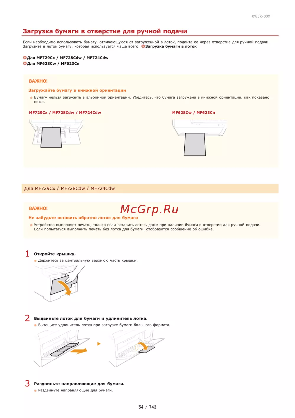 0W5K 00X Загрузка бумаги в отверстие для ручной подачи Если необходимо использовать бумагу отличающуюся от загруженной в лоток подайте ее через отверстие для ручной подачи Загрузите в лоток бумагу которая используется чаще всего СЗагрузка бумаги в лоток О Для МР729СХ MF728Cdw MF724Cdw О Для MFб28Cw МР623Сп ВАЖНО Загружайте бумагу в книжной ориентации Бумагу нельзя загрузить в альбомной ориентации Убедитесь что бумага загружена в книжной ориентации как показано ниже MF628Cw МР623СП МР729Сх MF728Cdw MF724Cdw Для МР729СХ MF728Cdw MF724Cdw ВАЖНО Не забудьте вставить обратно лоток для бумаги Устройство выполняет печать только если вставить лоток даже при наличии бумаги в отверстии для ручной подачи Если попытаться выполнить печать без лотка для бумаги отобразится сообщение об ошибке Откройте крышку Держитесь за центральную верхнюю часть крышки Выдвиньте лоток для бумаги и удлинитель лотка Вытащите удлинитель лотка при загрузке бумаги большого формата Раздвиньте направляющие для бумаги Раздвиньте направляющие для бумаги 54 743
