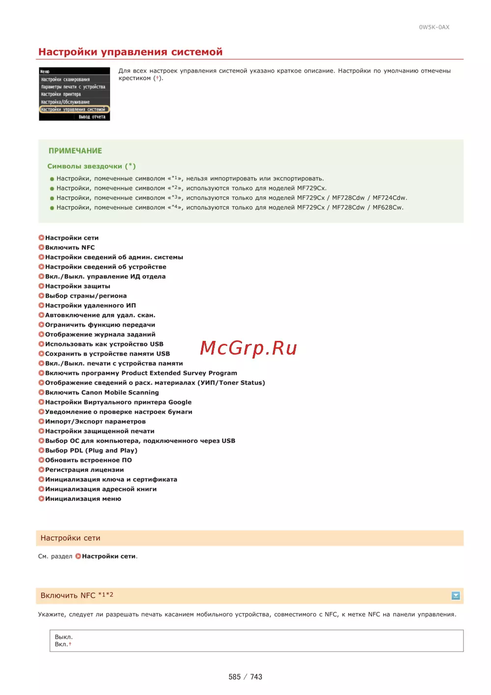 0W5K 0AX Настройки управления системой Для всех настроек управления системой указано краткое описание Настройки по умолчанию отмечены крестиком Немо настройки сканирования щражтры печати с устройства Настройки принтера настройиа обслуюп шание настройки управления системой Бивод отчета ПРИМЕЧАНИЕ Символы звездочки Настройки Настройки Настройки Настройки помеченныесимволом нельзя импортировать или экспортировать помеченныесимволом 2 используются только для моделейМР729Сх помеченныесимволом з используются только для моделей МР729Сх МГ728Сди МР724Сби помеченныесимволом 4 используются только для моделей МР729Сх МГ728Сди МР628Си ОНастройки сети ОВключить NFC ОНастройки сведений об админ системы ОНастройки сведений об устройстве ОВкл Выкл управление ИД отдела ОНастройки защиты ОВыбор страны региона ОНастройки удаленного ИП О Автовключение для удал скан ООграничить функцию передачи ООтображение журнала заданий ОИспользовать как устройство USB ОСохранить в устройстве памяти USB ОВкл Выкл печати с устройства памяти ОВключить программу Product Extended Survey Program ООтображение сведений о расх материалах УИП Toner Status ОВключить Canon Mobile Scanning ОНастройки Виртуального принтера Google Уведомление о проверке настроек бумаги ОИмпорт Экспорт параметров ОНастройки защищенной печати ОВыбор ОС для компьютера подключенного через USB ОВыбор PDL Plug and Play ООбновить встроенное ПО ОРегистрация лицензии ОИнициализация ключа и сертификата ОИнициализация адресной книги ОИнициализация меню Настройки сети См раздел ОНастройки сети Включить NFC 1 2 Укажите следует ли разрешать печать касанием мобильного устройства совместимого с NFC к метке NFC на панели управления Выкл ВклЛ 585 743
