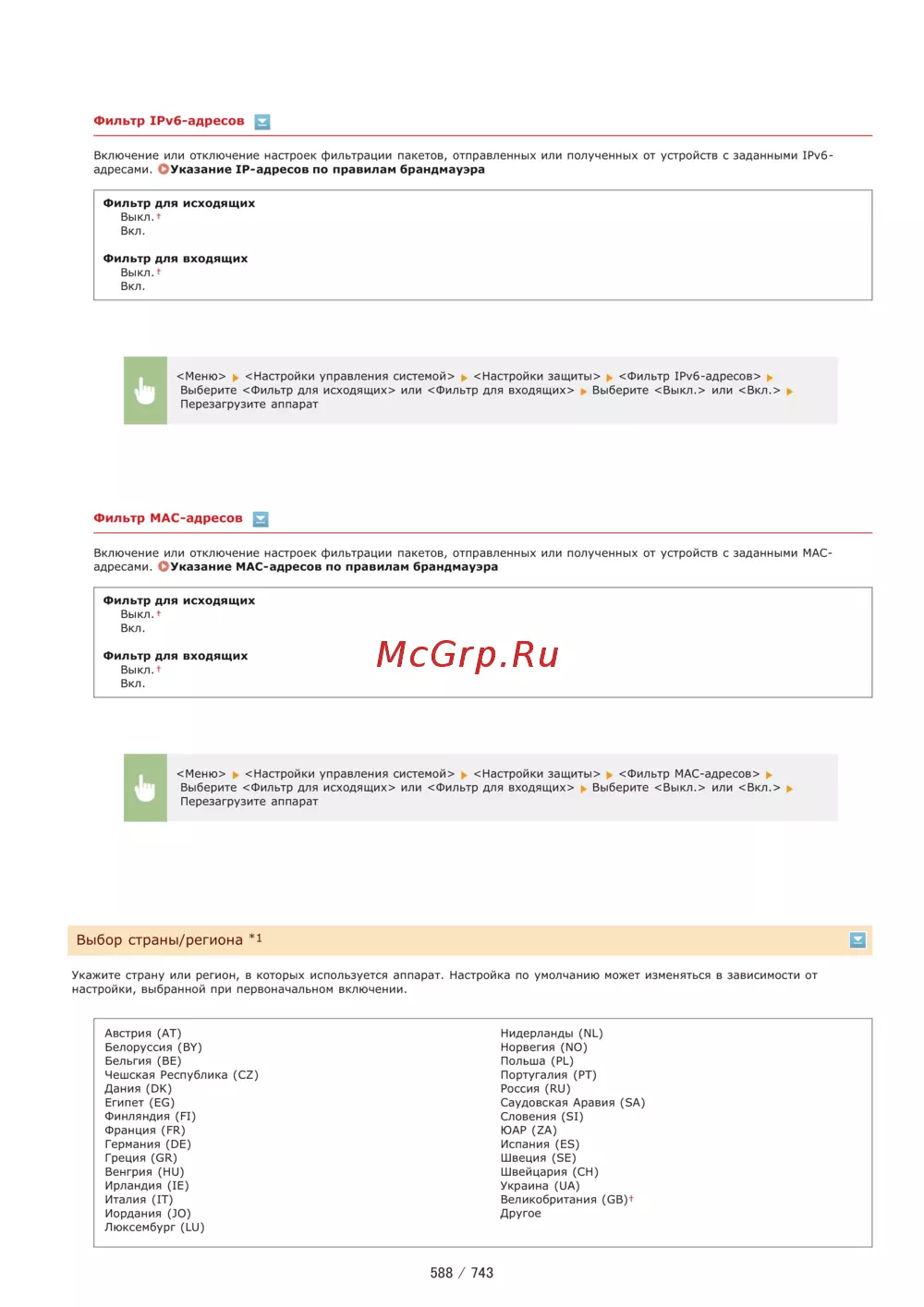 Фильтр IPv6 aдpecoв Включение или отключение настроек фильтрации пакетов отправленных или полученных от устройств с заданными 1РУ6адресами ОУказание 1Р адресов по правилам брандмауэра Фильтр для исходящих Выкл Вкл Фильтр для входящих Выкл г Вкл Меню Настройки управления системой Настройки защиты Фильтр 1Руб адресов к Выберите Фильтр для исходящих или Фильтр для входящих Выберите Выкл или Вкл Перезагрузите аппарат Фильтр МАС адресов Включение или отключение настроек фильтрации пакетов отправленных или полученных от устройств с заданными МАСадресами ОУказание МАС адресов по правилам брандмауэра Фильтр для исходящих Выкл 1 Вкл Фильтр для входящих Выкл 1 Вкл Меню Настройки управления системой Настройки защиты Фильтр МАС адресов Выберите Фильтр для исходящих или Фильтр для входящих Выберите Выкл или Вкл Перезагрузите аппарат В Выбор страны региона 1 Укажите страну или регион в которых используется аппарат Настройка по умолчанию может изменяться в зависимости от настройки выбранной при первоначальном включении Австрия АТ Белоруссия ВУ Бельгия ВЕ Чешская Республика С2 Дания СК Египет ЕС Финляндия R Франция ГК Германия СЕ Греция СК Венгрия Ни Ирландия 1Е Италия 1Т Иордания 30 Люксембург Ш Нидерланды И1 Норвегия NO Польша Р1 Португалия РТ Россия К11 Саудовская Аравия БА Словения Б1 ЮАР ИА Испания ЕБ Швеция БЕ Швейцария СН Украина иА Великобритания СВ Другое 588 743