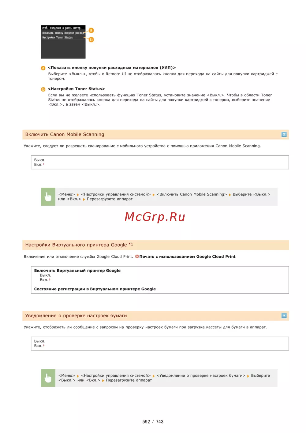отоб сведения показать кнопку о расх похулки катер расход Настройки Toner Status 0 Показать кнопку покупки расходных материалов УИП Выберите Выкл чтобы в Remote UI не отображалась кнопка для перехода на сайты для покупки картриджей с тонером ф Настройки Toner Status Если вы не желаете использовать функцию Toner Status установите значение Выкл Чтобы в области Toner Status не отображалась кнопка для перехода на сайты для покупки картриджей с тонером выберите значение Вкл а затем Выкл Включить Canon Mobile Scanning Укажите следует ли разрешать сканирование с мобильного устройства с помощью приложения Canon Mobile Scanning Выкл ВклЛ Меню Настройки управления системой Включить Canon Mobile Scannings Выберите Выкл или Вкл Перезагрузите аппарат Настройки Виртуального принтера Google 1 Включение или отключение службы Google Cloud Print Печать с использованием Google Cloud Print Включить Виртуальный принтер Google Выкл Вкл г Состояние регистрации в Виртуальном принтере Google Уведомление о проверке настроек бумаги Укажите отображать ли сообщение с запросом на проверку настроек бумаги при загрузке кассеты для бумаги в аппарат Выкл Вкл Меню Настройки управления системой Уведомление о проверке настроек бумаги Выберите Выкл или Вкл Перезагрузите аппарат 592 743