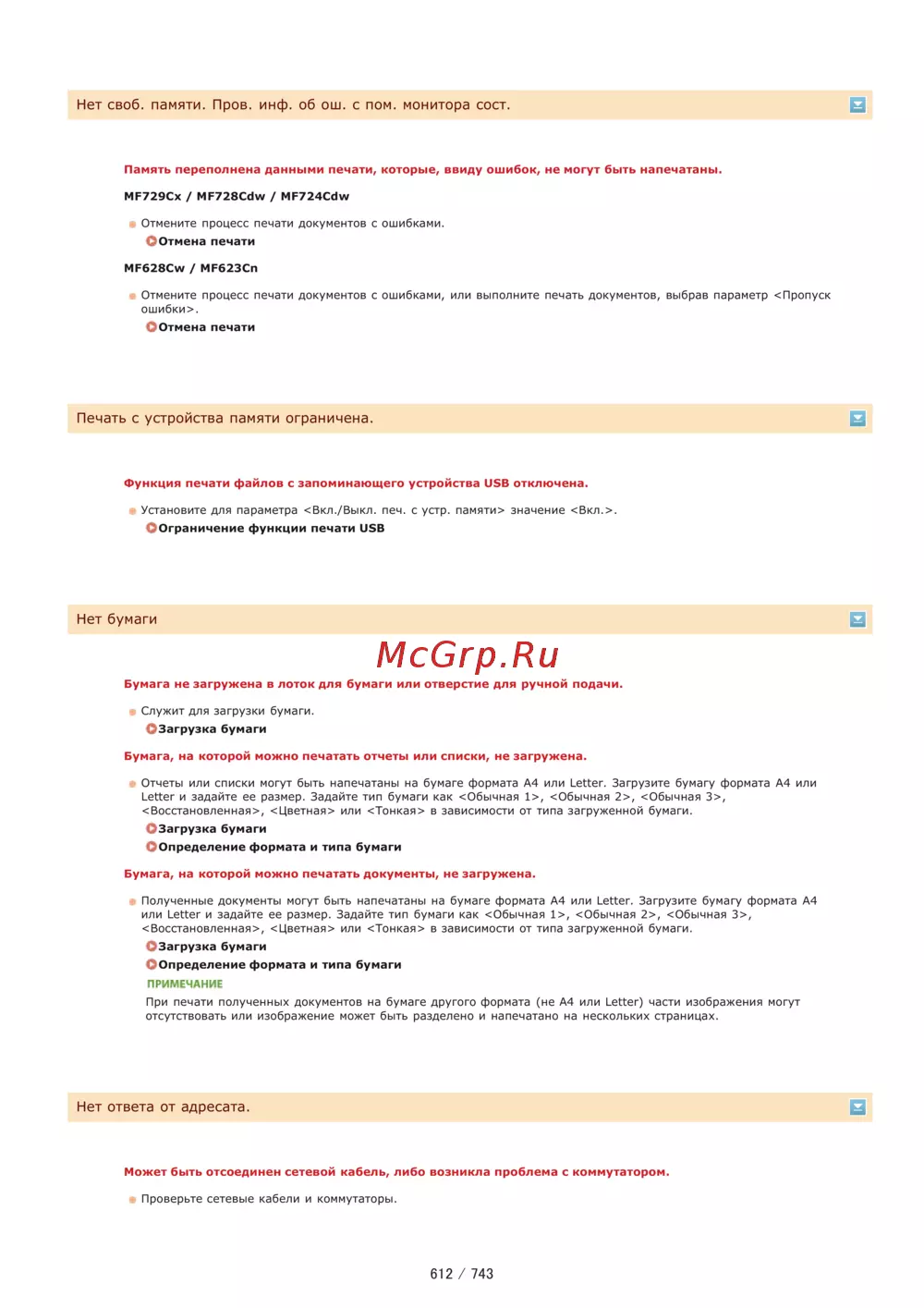 Canon i-SENSYS MF729Cx Лазерный \ светодиодный, Белый, Цветная, А4 — ошибки печати и загрузки бумаги: решение проблем [612/790]
