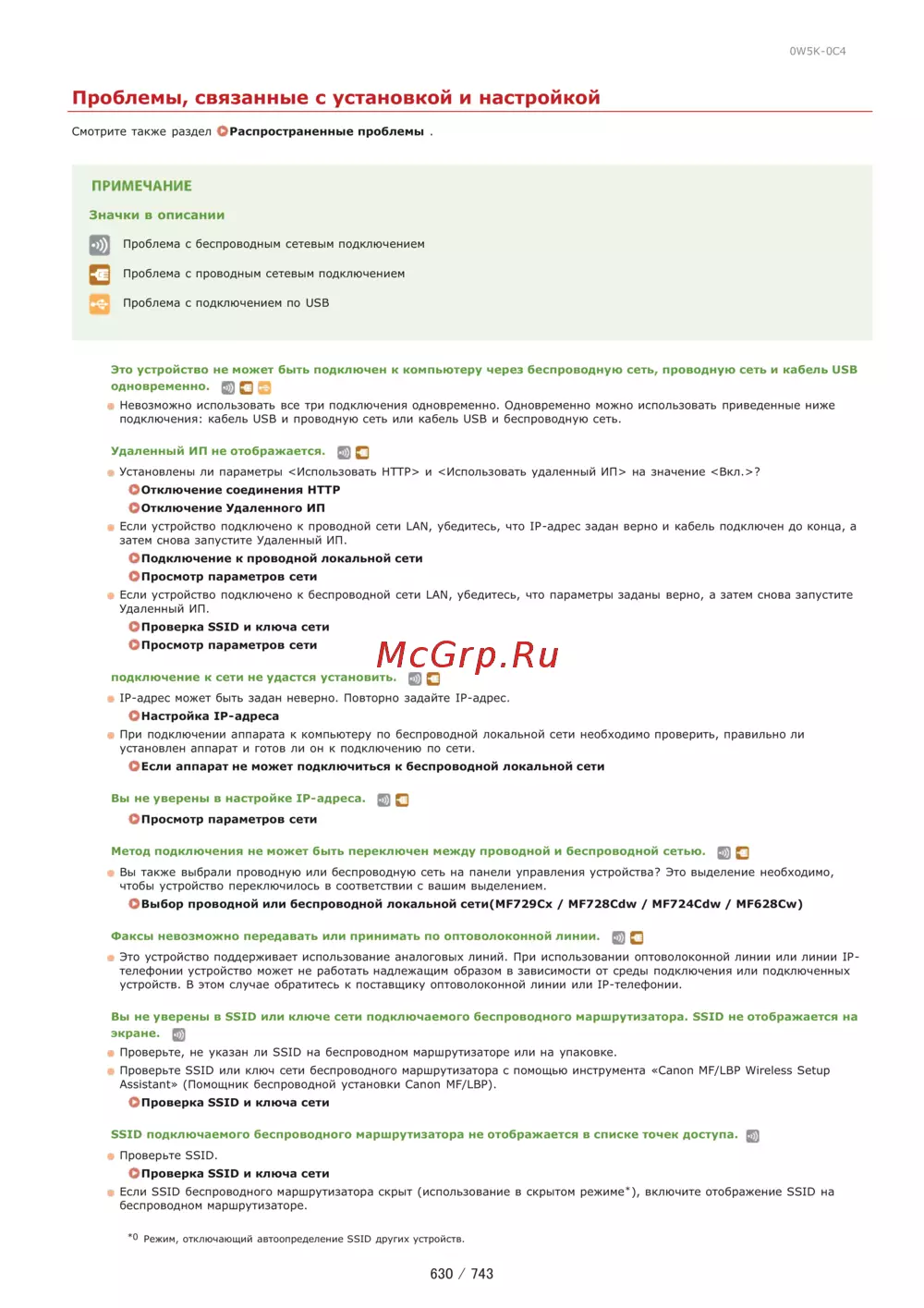 0W5K 0C4 Проблемы связанные с установкой и настройкой Смотрите также раздел Распространенные проблемы ПРИМЕЧАНИЕ Значки в описании Проблема с беспроводным сетевым подключением S Проблема с проводным сетевым подключением Проблема с подключением по USB Это устройство не может быть подключен к компьютеру через беспроводную сеть проводную сеть и кабель USB одновременно И Невозможно использовать все три подключения одновременно Одновременно можно использовать приведенные ниже подключения кабель USB и проводную сеть или кабель USB и беспроводную сеть Удаленный ИП не отображается И Установлены ли параметры Использовать НТТР и Использовать удаленный ИП на значение Вкл СОтключение соединения HTTP СОтключение Удаленного ИП Если устройство подключено к проводной сети LAN убедитесь что IP адрес задан верно и кабель подключен до конца а затем снова запустите Удаленный ИП СПодключение к проводной локальной сети ОПросмотр параметров сети Если устройство подключено к беспроводной сети LAN убедитесь что параметры заданы верно а затем снова запустите Удаленный ИП ОПроверка SSID и ключа сети ОПросмотр параметров сети подключение к сети не удастся установить Д IP адрес может быть задан неверно Повторно задайте 1Р адрес ОНастройка IP адреса При подключении аппарата к компьютеру по беспроводной локальной сети необходимо проверить правильно ли установлен аппарат и готов ли он к подключению по сети ОЕсли аппарат не может подключиться к беспроводной локальной сети Вы не уверены в настройке IP адреса Д ОПросмотр параметров сети Метод подключения не может быть переключен между проводной и беспроводной сетью 0 Д Вы также выбрали проводную или беспроводную сеть на панели управления устройства Это выделение необходимо чтобы устройство переключилось в соответствии с вашим выделением ОВыбор проводной или беспроводной локальной сети МЕ729Сх MF728Cdw MF724Cdw MF628Cw Факсы невозможно передавать или принимать по оптоволоконной линии Щ Д Это устройство поддерживает использование аналоговых линий При использовании оптоволоконной линии или линии IPтелефонии устройство может не работать надлежащим образом в зависимости от среды подключения или подключенных устройств В этом случае обратитесь к поставщику оптоволоконной линии или 1Р телефонии Вы не уверены в SSID или ключе сети подключаемого беспроводного маршрутизатора SSID не отображается на экране 0 Проверьте не указан ли SSID на беспроводном маршрутизаторе или на упаковке Проверьте SSID или ключ сети беспроводного маршрутизатора с помощью инструмента Canon MF LBP Wireless Setup Assistant Помощник беспроводной установки Canon MF LBP ОПроверка SSID и ключа сети SSID подключаемого беспроводного маршрутизатора не отображается в списке точек доступа Щ Проверьте SSID ОПроверка SSID и ключа сети Если SSID беспроводного маршрутизатора скрыт использование в скрытом режиме включите отображение SSID на беспроводном маршрутизаторе Режим отключающий автоопределение SSID других усгройсгв 630 743