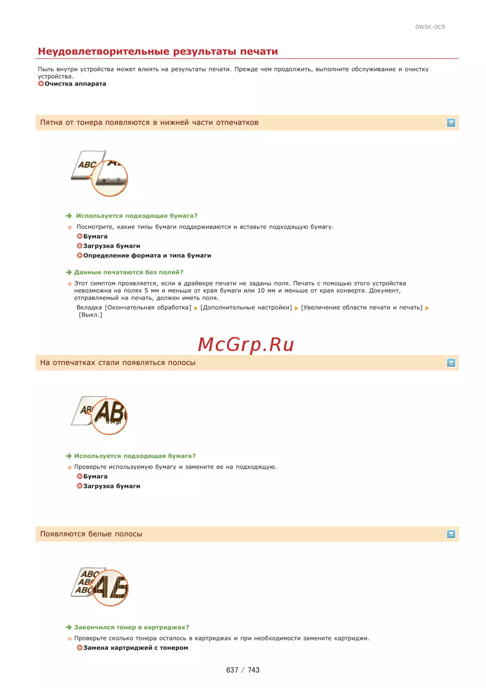 0W5K 0C9 Неудовлетворительные результаты печати Пыль внутри устройства может влиять на результаты печати Прежде чем продолжить выполните обслуживание и очистку устройства ООчистка аппарата Пятна от тонера появляются в нижней части отпечатков Используется подходящая бумага Посмотрите какие типы бумаги поддерживаются и вставьте подходящую бумагу О Бума га О Загрузка бумаги Определение формата и типа бумаги Данные печатаются без полей Этот симптом проявляется если в драйвере печати не заданы поля Печать с помощью этого устройства невозможна на полях 5 мм и меньше от края бумаги или 10 мм и меньше от края конверта Документ отправляемый на печать должен иметь поля Вкладка Окончательная обработка Дополнительные настройки Увеличение области печати и печать Выкл На отпечатках стали появляться полосы Используется подходящая бумага Проверьте используемую бумагу и замените ее на подходящую О Бума га О Загрузка бумаги Появляются белые полосы Закончился тонер в картриджах Проверьте сколько тонера осталось в картриджах и при необходимости замените картриджи О Замена картриджей с тонером 637 743