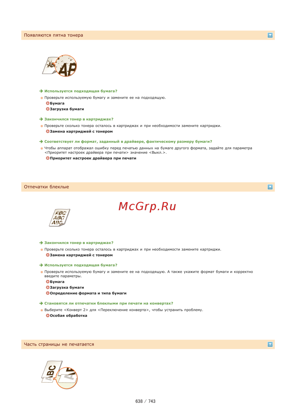 В Появляются пятна тонера Используется подходящая бумага Проверьте используемую бумагу и замените ее на подходящую О Бума га О Загрузка бумаги Закончился тонер в картриджах Проверьте сколько тонера осталось в картриджах и при необходимости замените картриджи Замена картриджей с тонером Соответствует ли формат заданный в драйвере фактическому размеру бумаги Чтобы аппарат отображал ошибку перед печатью данных на бумаге другого формата задайте для параметра Приоритет настроек драйвера при печати значение Выкл О Приоритет настроек драйвера при печати В Отпечатки блеклые Закончился тонер в картриджах Проверьте сколько тонера осталось в картриджах и при необходимости замените картриджи Замена картриджей с тонером Используется подходящая бумага Проверьте используемую бумагу и замените ее на подходящую А также укажите формат бумаги и корректно введите параметры О Бума га С Загрузка бумаги О Определение формата и типа бумаги Становятся ли отпечатки блеклыми при печати на конвертах Выберите Конверт 2 для Переключение конверта чтобы устранить проблему О Особая обработка Часть страницы не печатается 638 743