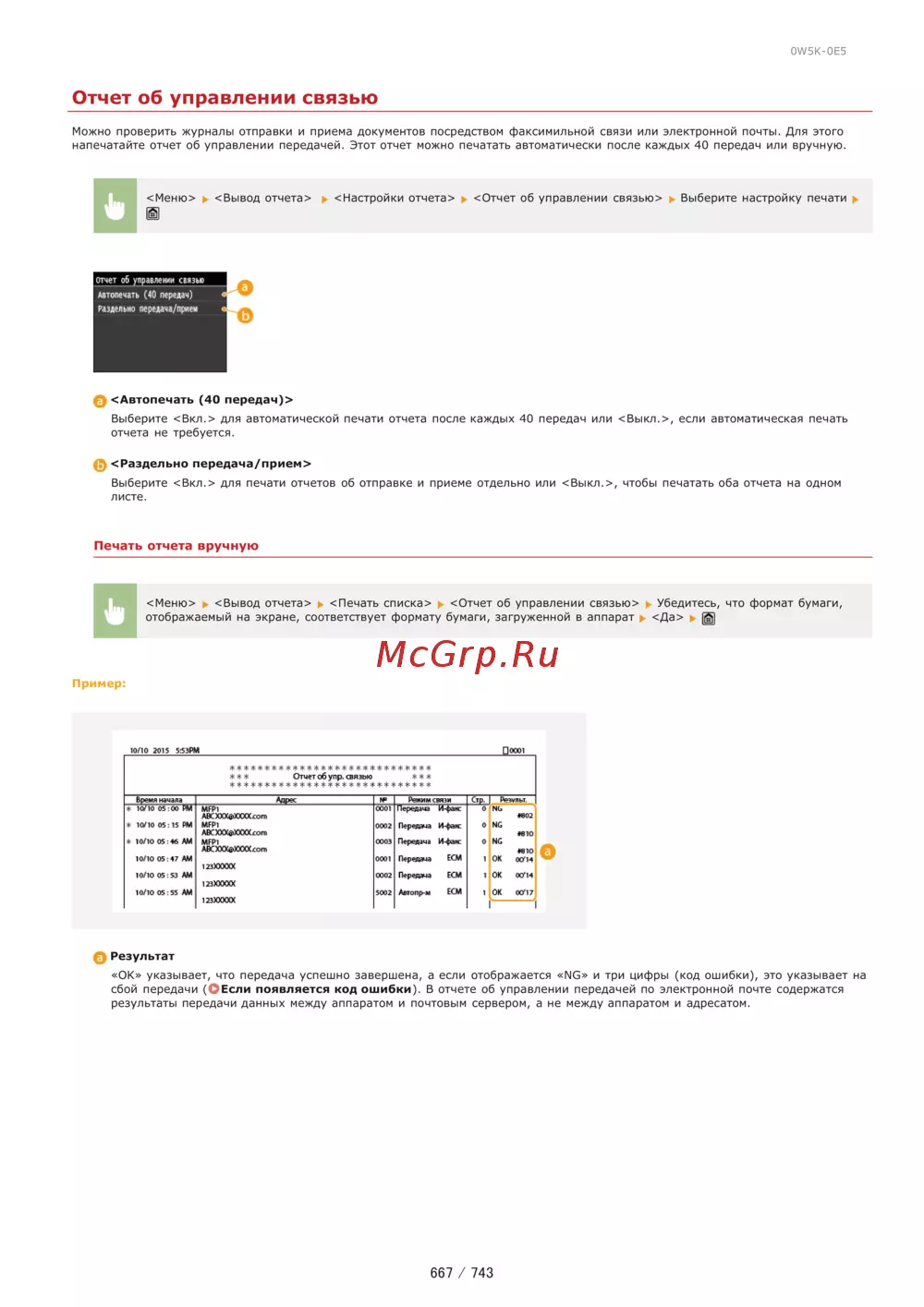 0W5K 0E5 Отчет об управлении связью Можно проверить журналы отправки и приема документов посредством факсимильной связи или электронной почты Для этого напечатайте отчет об управлении передачей Этот отчет можно печатать автоматически после каждых 40 передач или вручную Меню Вывод отчета Настройки отчета Отчет об управлении связью Выберите настройку печати отчет об упраапежи связью Автопечать 40 передач Раздельно передача прнем ф Автопечать 40 передач Выберите Вкл для автоматической печати отчета после каждых 40 передач или Выкл если автоматическая печать отчета не требуется 0 Раздельно передача прием Выберите Вкл для печати отчетов об отправке и приеме отдельно или Выкл чтобы печатать оба отчета на одном листе Печать отчета вручную Меню Вывод отчета Печать списка Отчет об управлении связью к Убедитесь что формат бумаги отображаемый на экране соответствует формату бумаги загруженной в аппарат Да Пример 1 10 10 2015 55 3РМ о Отч етсбупр свяэ ю кг Время начала 10 10 05 РМ 10 10 05 15 РМ АдрЗС Режим связи Передача И фак Стр йемльт ГКа МЕР1 АКХХХфХХХХсош 0001 МРР1 0002 Передача И фак сооз Передача И фак 0001 Передача ЕСМ I ОК ОСУ 14 СЮ02 Передача ЕСМ I ОК ОСУ 14 5002 ЕСМ 1 ОК 02 NO АКХХХфХХХХсош 10 10 05 46 АМ МЕР1 АКХХХ ЮОСХгот 10 10 05 47 АМ ИС 123Ю00 10 10 05 53 АМ 123Ю00 10 10 05 55 АМ Автопр м 0СУ17 123Ю00 Результат ОК указывает что передача успешно завершена а если отображается NO и три цифры код ошибки это указывает на сбой передачи ОЕсли появляется кодошибки В отчете об управлении передачей по электронной почте содержатся результаты передачи данных между аппаратом и почтовым сервером а не между аппаратом и адресатом 667 743