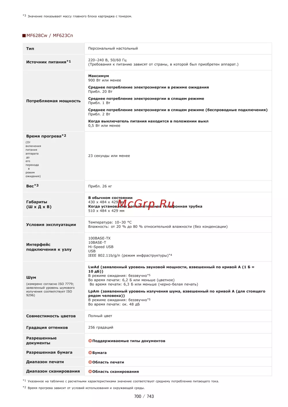 3 Значение показывает массу главного блока картриджа с тонером MF628CW MF623Cn Тип Персональный настольный Источник питания 1 220 240 В 50 60 Гц Требования к питанию зависят от страны в которой был приобретен аппарат Максимум 900 Вт или менее Среднее потребление электроэнергии в режиме ожидания Прибл 20 Вт Потребляемая мощность Среднее потребление электроэнергии в спящем режиме Прибл 1 Вт Среднее потребление электроэнергии в спящем режиме беспроводные подключения Прибл 2 Вт Когда выключатель питания находится в положении выкл 0 5 Вт или менее Время прогрева 2 От включения питания аппарата до 23 секунды или менее его перехода в режим ожидания Вес з Прибл 26 кг Габариты Ш х Д х В В обычном состоянии 430 х 484 х 429 мм Когда установлена дополнительная телефонная трубка 510 х 484 х 429 мм Условия эксплуатации Температура 10 30 C Влажность от 20 до 80 относительной влажности без конденсации Интерфейс подключения к узлу 100BASE TX 10BASE T Hi Speed USB USB IEEE 802 11b g n режим инфраструктуры 4 Шум измерено согласно ISO 7779 заявленный уровень шумового излучения соответствует ISO 9296 LwAd заявленный уровень звуковой мощности взвешенный по кривой А 1 Б 10 дБ В режиме ожидания беззвучно 5 Во время печати 6 2 Б или меньше цветное Во время печати 6 3 Б или меньше черно белая печать LpAm заявленный уровень излучения шума взвешенный по кривой А для стоящего рядом человека В режиме ожидания беззвучно 5 Во время печати ок 48 дБ Совместимость цветов Полный цвет Градация оттенков 256 градаций Разрешенные документы С Поддерживаемые типы документов Разрешенная бумага О Бумага Диапазон печати Область печати Диапазон сканирования Область сканирования 1 Указанное на табличке с расчетными характеристиками значение соответствует среднему потреблению питающего тока 2 Время прогрева зависит от условий использования и окружающей среды 700 743