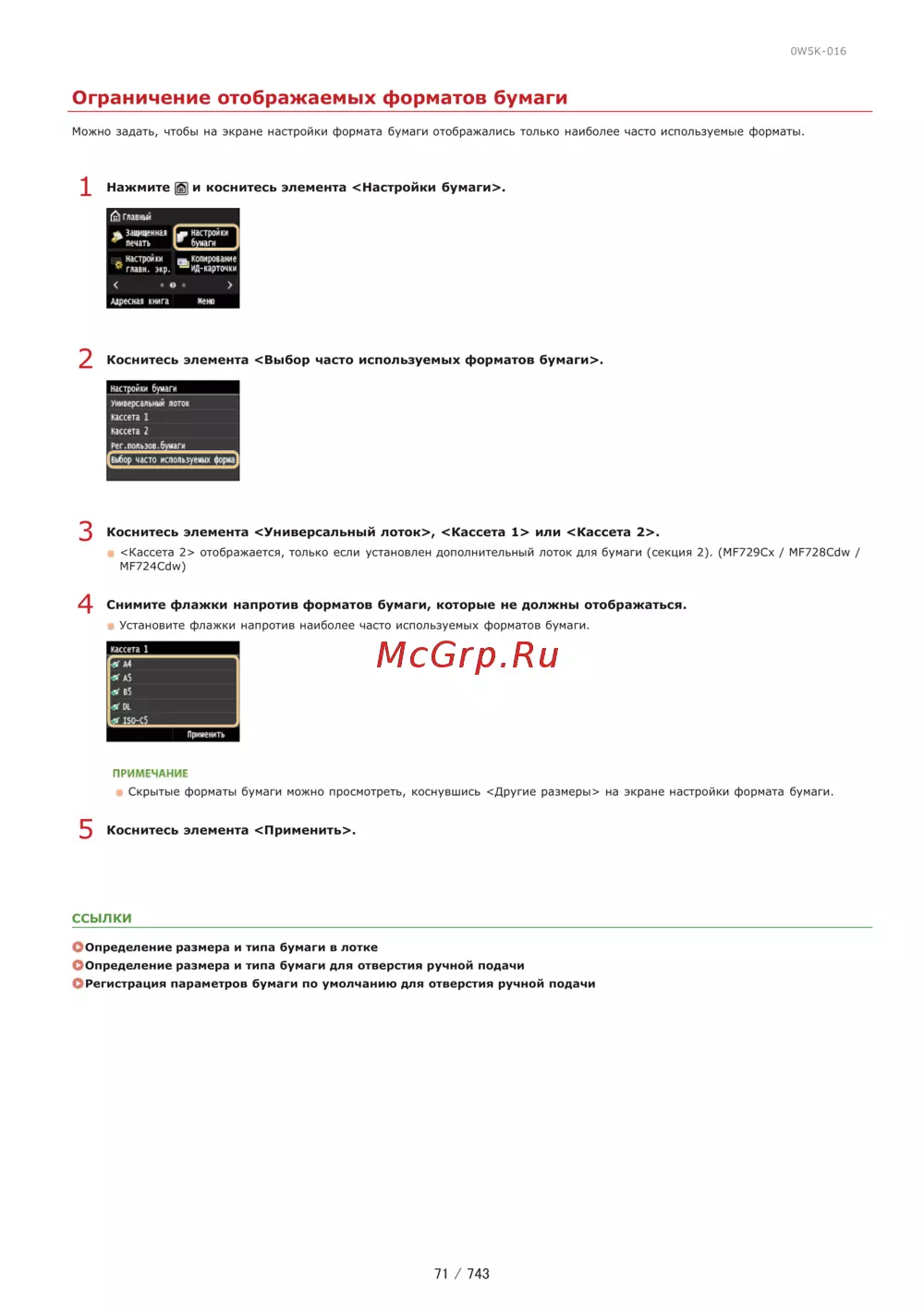 Canon i-SENSYS MF729Cx Лазерный \ светодиодный, Белый, Цветная, А4 — настройка отображения форматов бумаги на экране устройства [71/790]