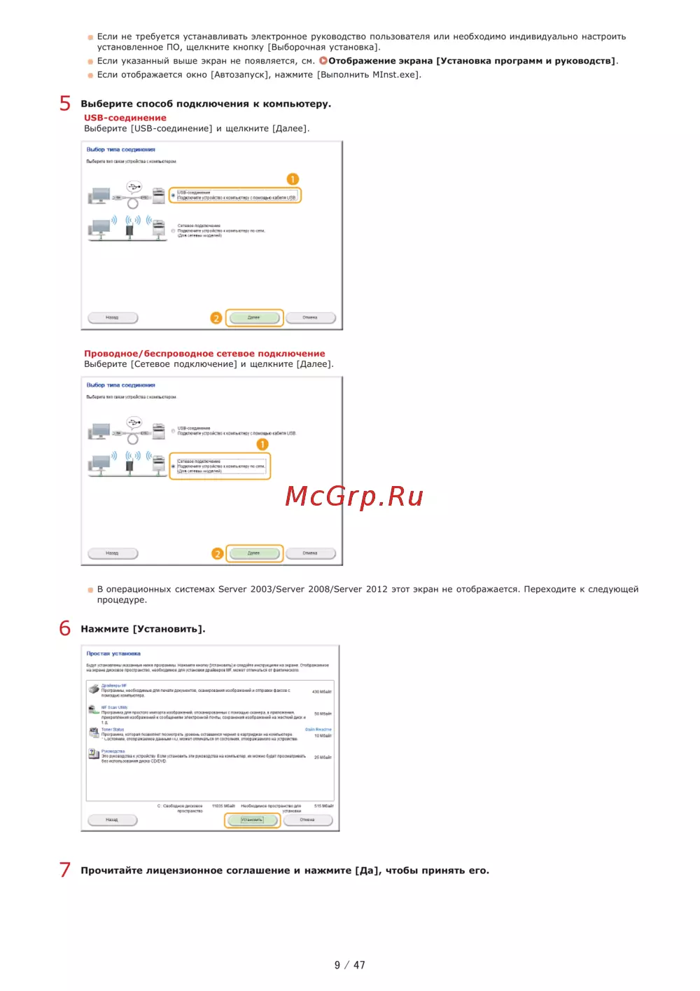 Если не требуется устанавливать электронное руководство пользователя или необходимо индивидуально настроить установленное ПО щелкните кнопку Выборочная установка Если указанный выше экран не появляется см Отображение экрана Установка программ и руководств Если отображается окно Автозапуск нажмите Выполнить MInst exe 5 Выберите способ ибВ соединение подключения к компьютеру Выберите 115В соединение и щелкните Далее Выбор типа соединения EUbafoiM т п trau told Проводное беспроводное сетевое подключение Выберите Сетевое подключение и щелкните Далее Выбор типа соединения ЕЬБагшм т п стаи г шиелисы В операционных системах Server 2003 Server 2008 Server 2012 этот экран не отображается Переходите к следующей процедуре 6 Нажмите Установить Простая устаиовка жрана лрасграхсгоо на 5и айдпй ст а с4 и доагш чаыг мкаготгы каor раапжкхою Лрогрмшм пенсии дш печати аамтрзаениа 1с4рак4ыайг 1пр44М1 фекоис A NFSMIWIlb Пмгсаил Л гсссгсгаитсс зик 1Г1 Аогэ н1 л и спс 1ми оежчи i п ипз а шм сибзН лсифииннэимбраишй л ли ые гикя ш шш1В н1 мт н2 аяаси n SW14 1 Просрам гоми гч11о 1 аг гчеизгеч лшн кшане агассктаатвтнаашпи меме amr loin на 1И1М0ГЧ1Ч ЮММЙТ i I Л Эю в twi мои я глмгтпif Еан 1Сганлгл ат ем маы на тагын га rv г aw аки cntMtxic шт CBWD I 2s моа C Cl ебЩнЗС ыиш 4 reww нт о Прочитайте лицензионное соглашение и нажмите Да чтобы принять его 9 47