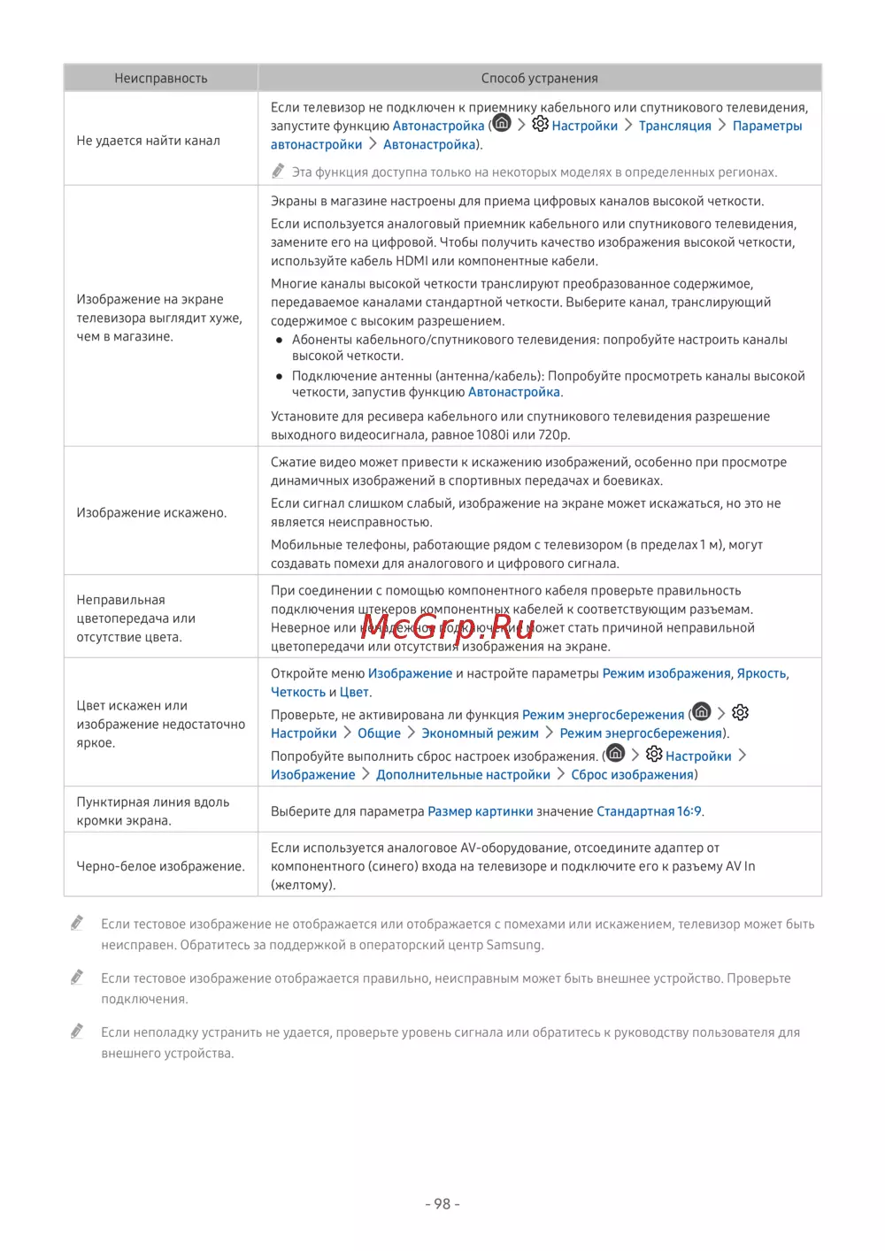 " Если тестовое изображение не отображается или отображается с помехами или искажением, телевизор может быть