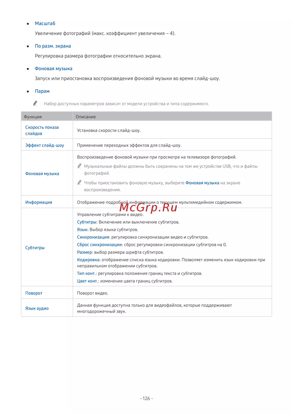" Набор доступных параметров зависит от модели устройства и типа содержимого.