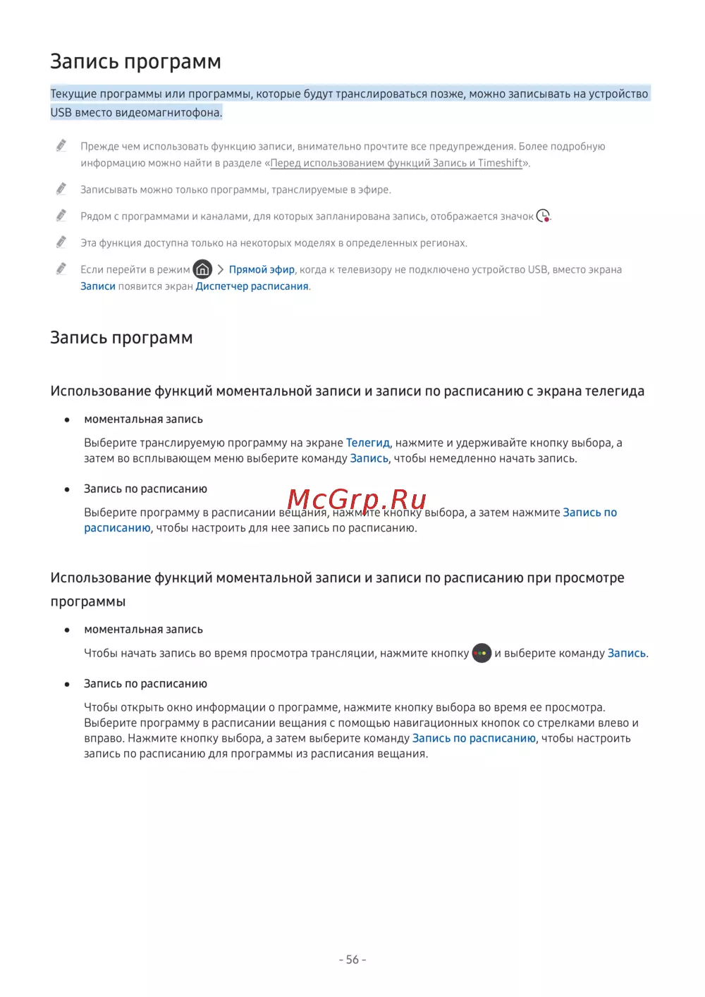 - Использование функций моментальной записи и записи по расписанию отображающихся в окне информации о программе p.152
