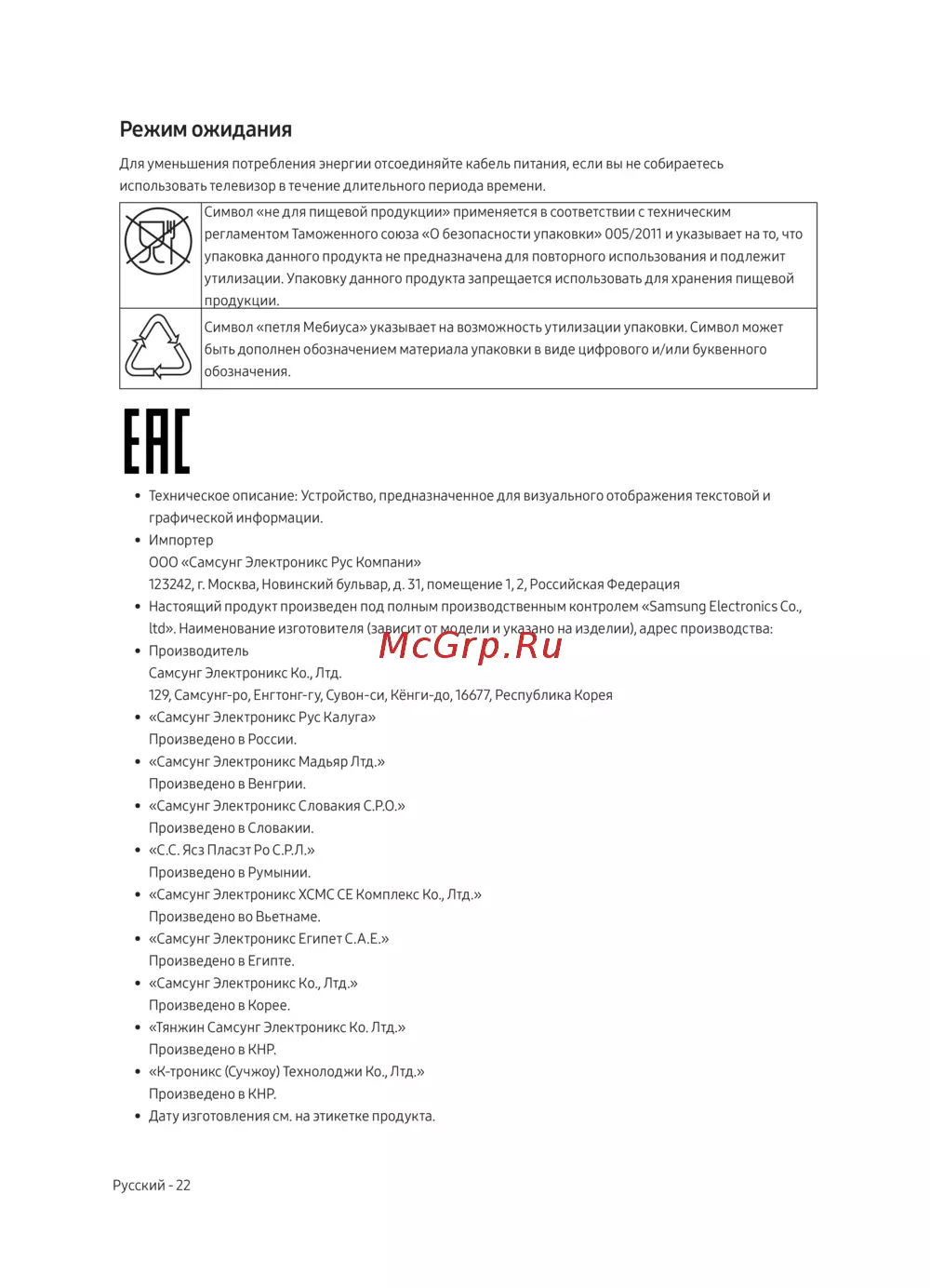 Samsung UE49MU6303UXRU — инструкция по эксплуатации телевизора: энергосбережение и экологические символы упаковки [22/92]