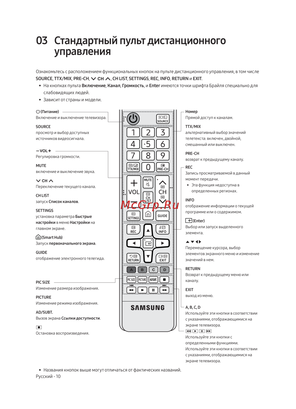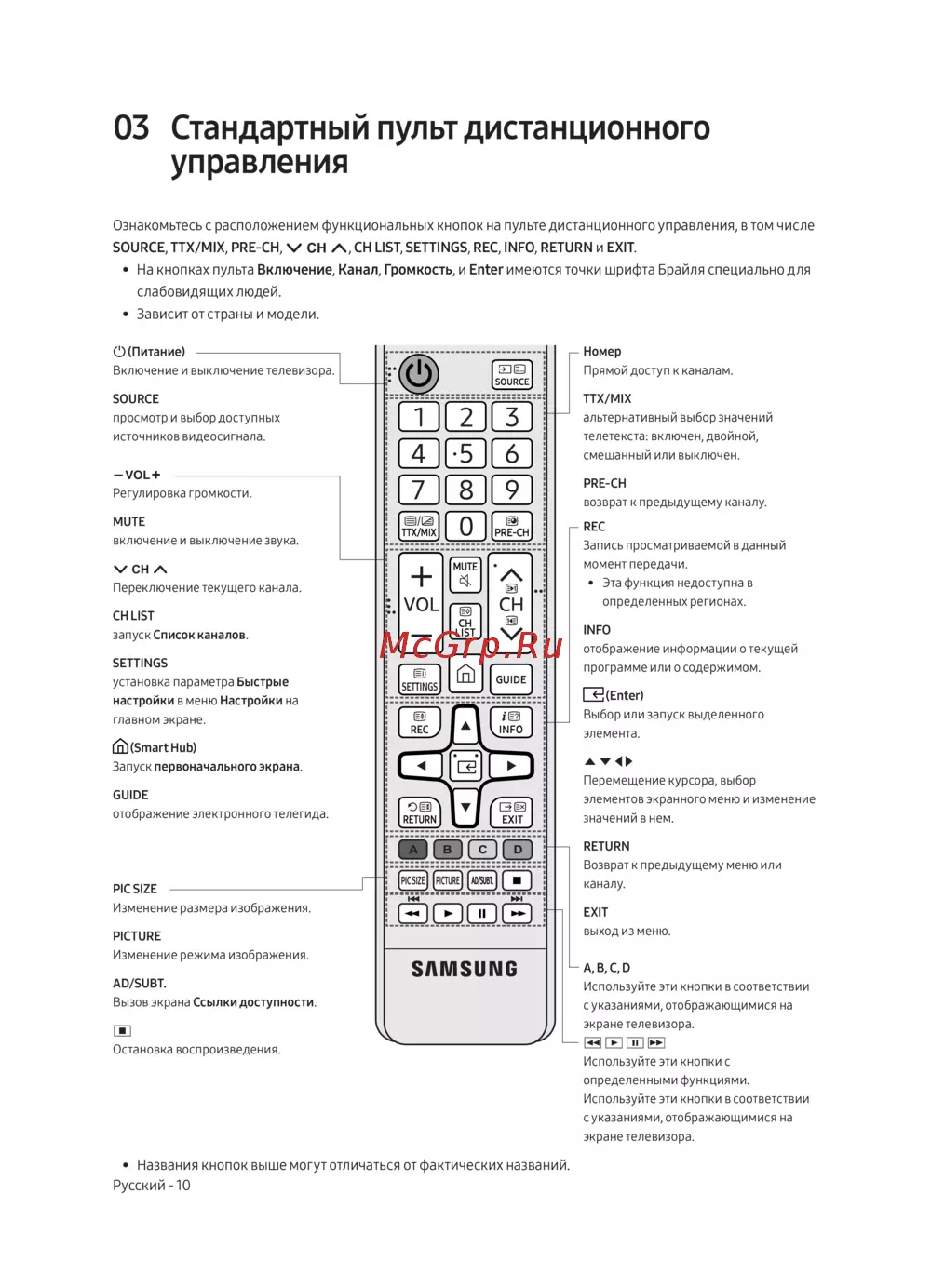 Samsung UE40MU6103UXRU [10/92] Названия кнопок выше могут отличаться от фактических названий