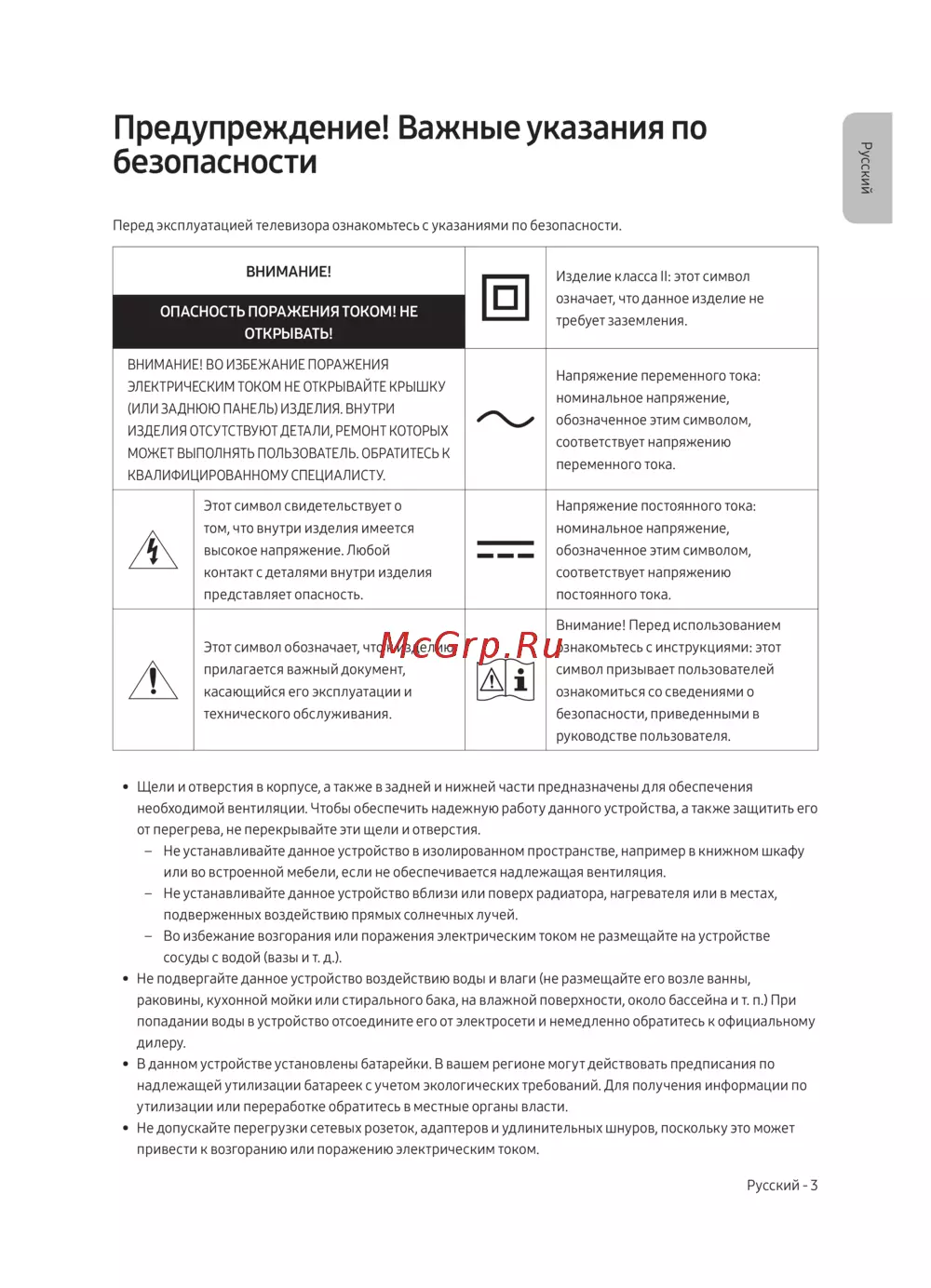 Samsung UE40MU6103UXRU — инструкции по безопасности для эксплуатации электрических устройств [3/92]