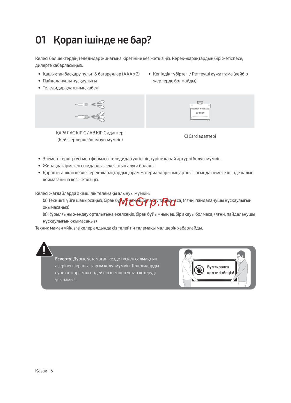 - Сақтық шарасы теледидардың құлап түсуіне жол бермеу үшін оны қабырғаға бекіту p.75