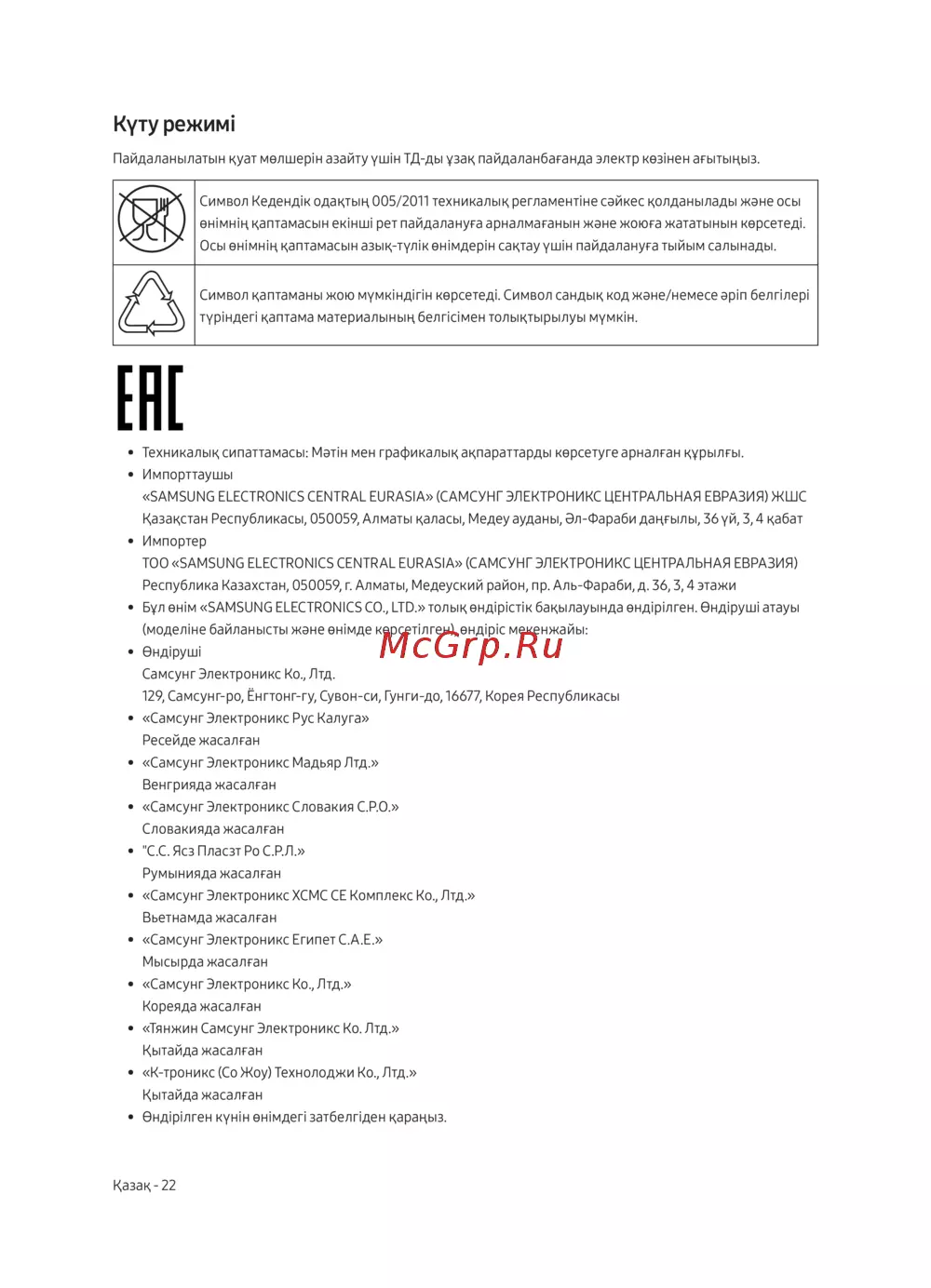 • Бұл өнім «SAMSUNG ELECTRONICS CO., LTD.» толық өндірістік бақылауында өндірілген. Өндіруші атауы