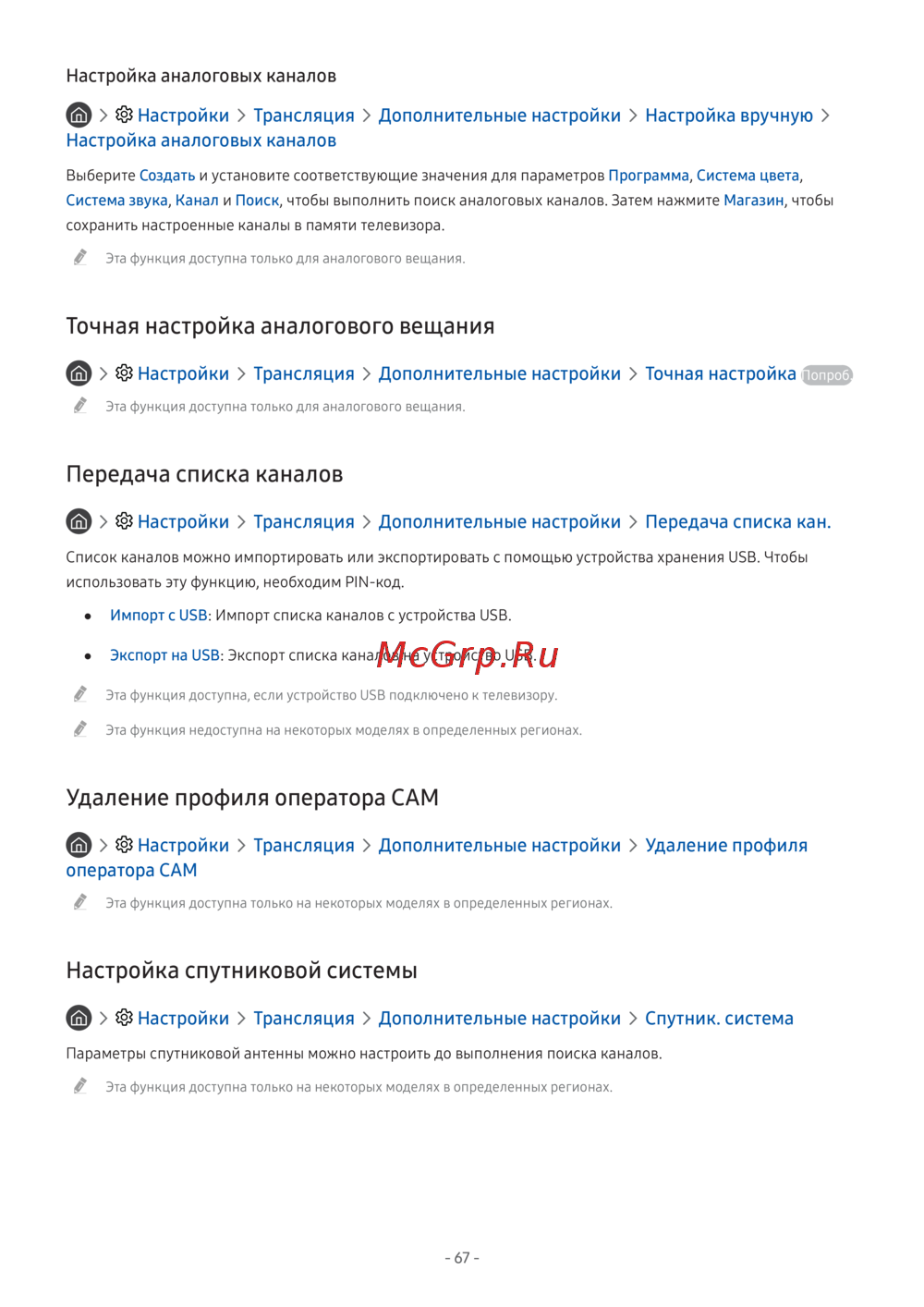 Узнайте, как настроить аналоговые и спутниковые каналы на вашем телевизоре. Импортируйте и экспортируйте списки каналов с помощью USB, а также удаляйте профили операторов.
