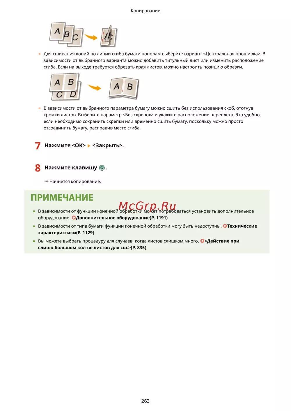 Узнайте, как выбрать параметры сшивания и обрезки бумаги для эффективного копирования. Настройте расположение сгиба и используйте различные методы сшивания.